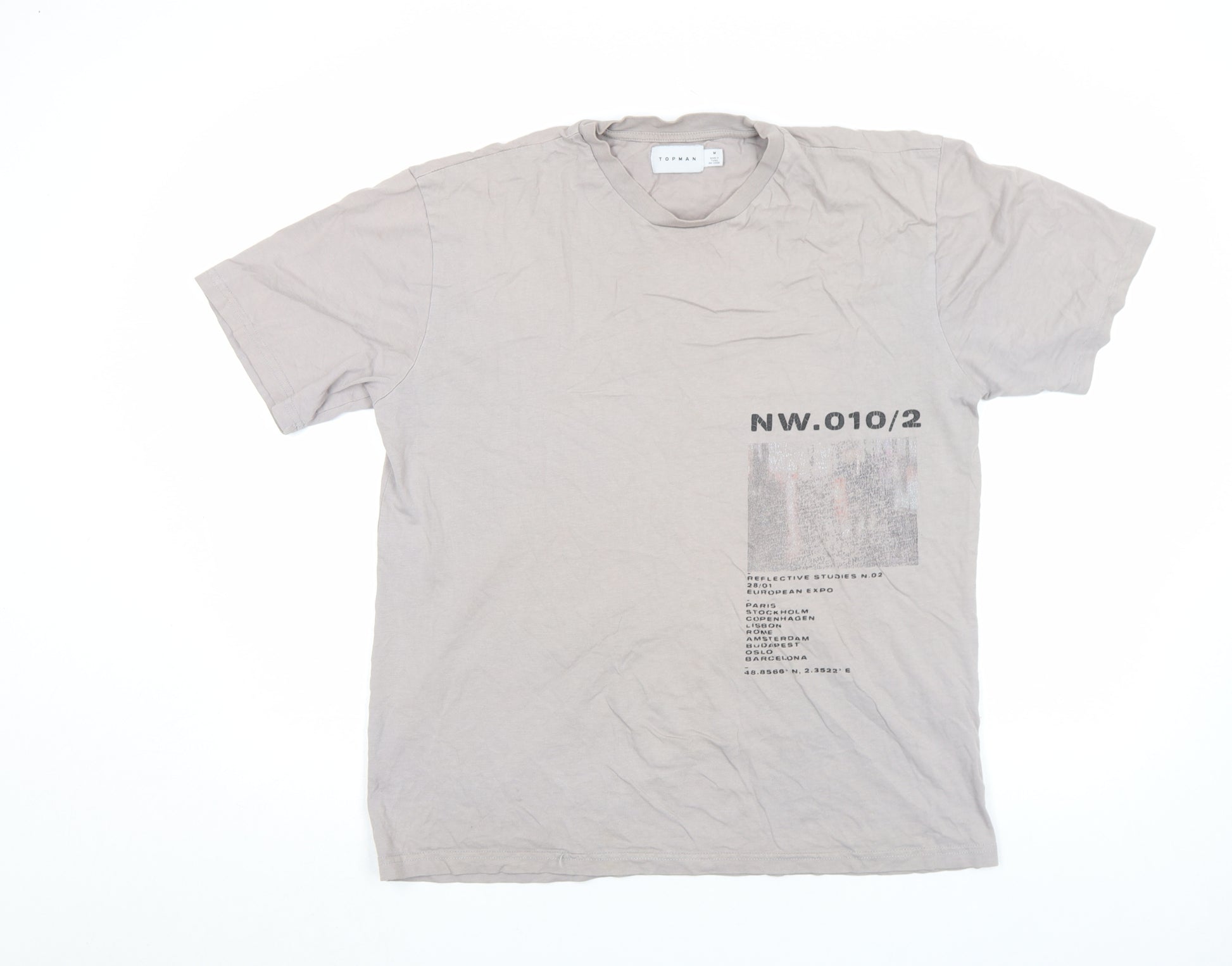 Elevate your casual wardrobe with this stylish grey graphic print T-shirt from Topman. Designed for modern men who value both comfort and style, this short sleeve crew neck tee features a minimalist yet eye-catching printed design inspired by city themes, lending an effortlessly urban edge to your look. Made from soft 100% cotton, the fabric ensures a breathable and lightweight feel, perfect for warmer seasons or comfortable year-round layering. The T-shirt showcases a regular fit cut, offering a relaxed and versatile silhouette that suits everyday wear, while the jersey fabric provides great shape retention and durability. The neutral grey tone makes it easy to pair with jeans, chinos or shorts, adapting effortlessly from casual streetwear to laid-back weekend outfits. Crafted in Turkey with quality finishing, this Topman piece promises the reliable craftsmanship and contemporary design the brand is known for. Despite minor signs of wear and a small mark on the front, the T-shirt remains in good condition and ready to wear. Simple yet stylish, it’s perfect for those who appreciate understated fashion with subtle graphic flair. Ideal for spring, summer and early autumn wear, this versatile tee is a brilliant addition to any wardrobe, offering an effortlessly cool aesthetic for daytime outings, festivals or relaxed city strolls. Add this Topman grey graphic crew neck to your wardrobe today and enjoy a soft feel, versatile styling and dependable comfort. Whether layered under a jacket or worn solo, it’s a must-have casual essential for the fashion-conscious gentleman looking for a comfortable yet contemporary look that transitions easily between seasons.