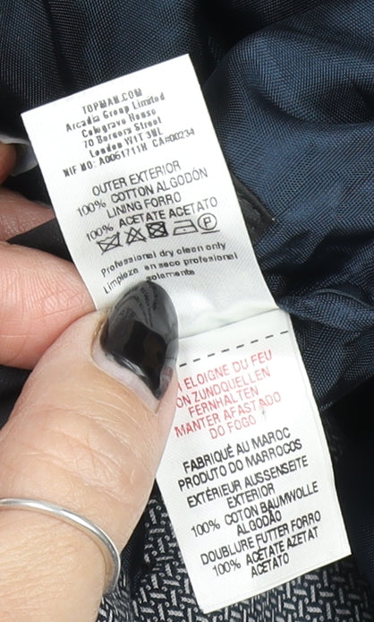 This stylish Topman men’s blazer jacket in size 36 offers a contemporary look perfect for smart and semi-formal occasions. Crafted from 100% cotton, this grey single-breasted blazer delivers both comfort and breathability. The subtle herringbone texture gives a refined finish suitable for the office, weddings, or evening events. The jacket features a classic notch lapel, two-button front fastening, and double vented back for improved movement and tailored elegance. The inner acetate lining enhances smooth wear, while functional interior pockets provide practicality without compromising style. The slim fit design contours neatly to the body, creating a sharp silhouette ideal for modern dressing. Its mid-grey shade allows for versatile pairing with trousers, chinos, or dark denim—making it a wardrobe essential for every season, especially during spring and autumn. Professionally dry clean only, ensuring long-lasting quality and shape retention. Despite light signs of previous use, the jacket remains in excellent condition with no damage. This Topman blazer combines timeless tailoring with a clean modern aesthetic that works effortlessly across business and formal settings. Reliable, well-constructed, and fashionable, it’s a smart investment piece reflecting Topman’s reputation for contemporary menswear. Perfect for anyone seeking a polished yet understated look, this cotton blazer maintains an easy balance of comfort and sophistication. Enhance your outfit with this versatile jacket that transitions seamlessly from the boardroom to evening events, defining a confident and modern gentleman’s style.