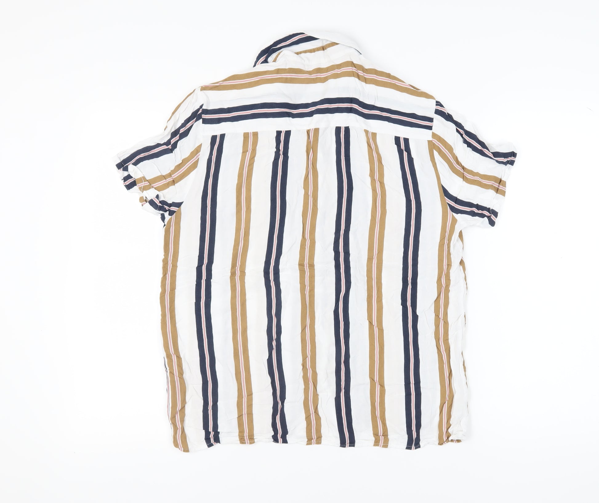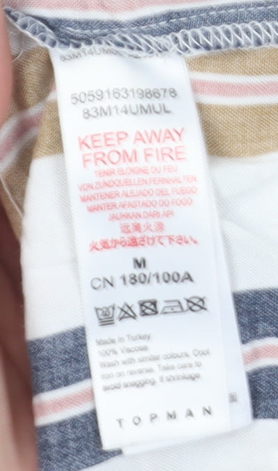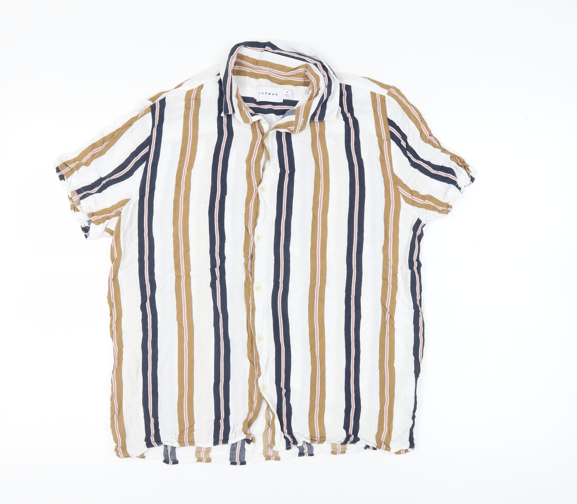 Elevate your casual wardrobe with this vibrant Topman button-up shirt, perfect for any relaxed outing. Crafted in a size medium, this multicoloured striped shirt offers a cheerful array of hues that will add a pop of personality to your style. Ideal for the modern man looking to make a statement, its short sleeves ensure comfort in warmer weather, making it a dependable choice for both spring and summer occasions. Made from 100% viscose, the shirt provides a light and breathable feel against the skin, allowing for all-day wear without sacrificing style or comfort. This shirt's design is focused on ease, from the casual yet tidy button closure to its effortless care; simply machine wash to keep it looking fresh. Whether you're heading to a casual brunch or a weekend getaway, this striped shirt delivers on both fashion and functionality. Although used, it boasts an excellent condition with no visible defects, ensuring you enjoy a high-quality garment. Match it with a pair of jeans or shorts for a laid-back look that's full of charm and charisma.