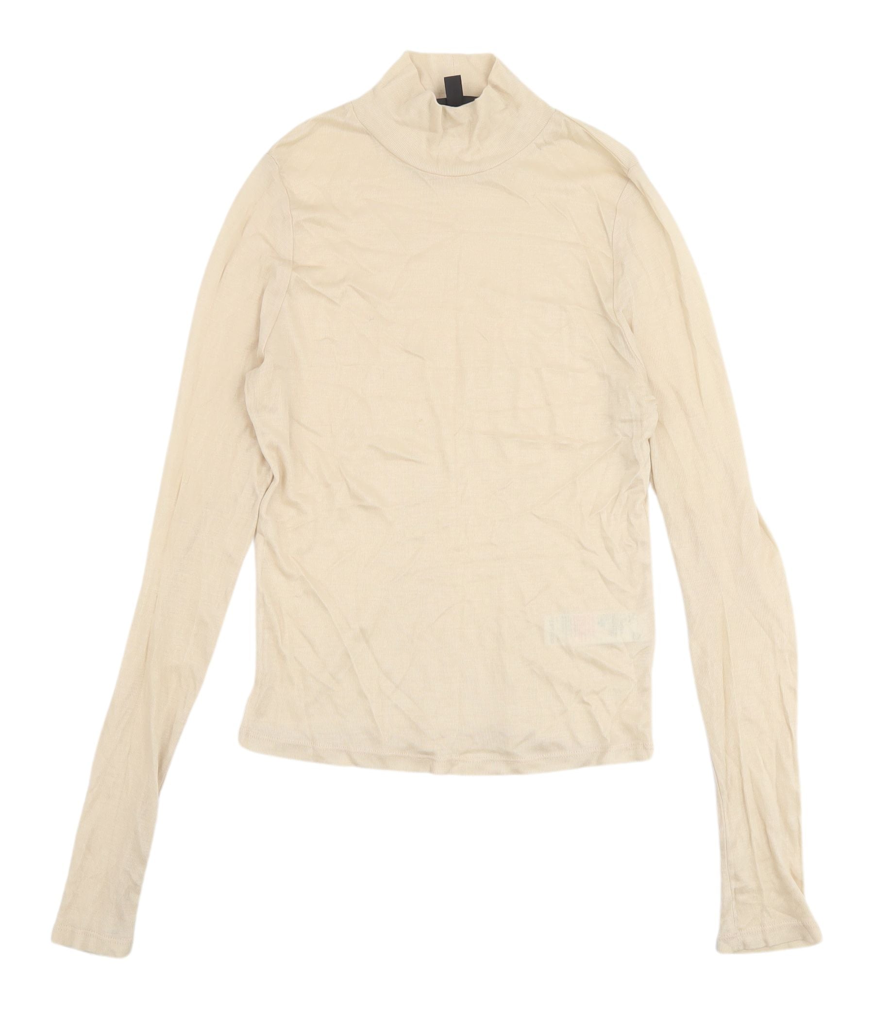 Introducing a versatile addition to your wardrobe, the Topshop Beige High Neck Long Sleeve Top in a size 12. Crafted from premium Lyocell material, this top offers a sublime blend of comfort and style, perfect for all seasons. Its classic beige hue is complemented by a smart high neckline and fitted sleeves, making it the ideal choice for both casual outings and relaxed work settings. Designed with a pullover closure, the top ensures ease of wear, while the breathable jersey fabric enhances your comfort. Whether paired with jeans for a laid-back look or dressed up with a skirt and accessories, this Topshop piece is a must-have in your fashion arsenal. Slightly worn with love, it maintains excellent condition for its next adventure. Easy to care for with machine washable instructions, this top is not only stylish but also practical for everyday use. Elevate your daily style with this timeless piece that offers a subtle yet impactful presence in any outfit.