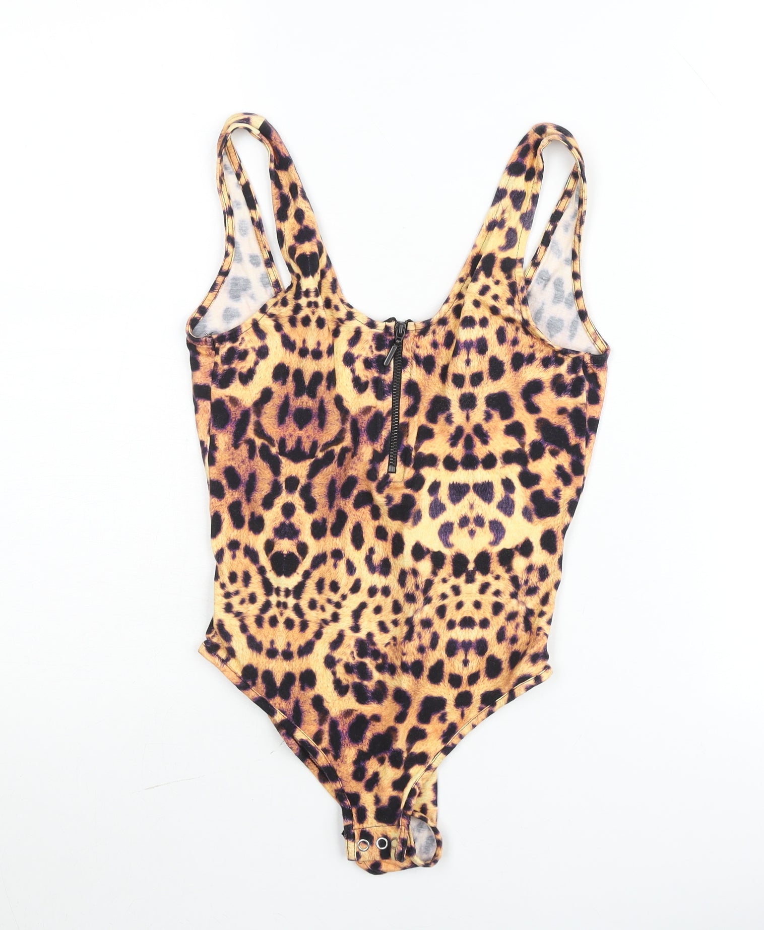 Add a fierce touch to your wardrobe with this stunning Topshop women’s bodysuit in an eye-catching leopard print design. Crafted from a soft, stretchy jersey blend of polyester and elastane, this sleeveless one-piece offers a flattering slim fit that hugs your body comfortably. The convenient front zip detail adds a stylish edge while making the bodysuit easy to wear. In bold multicoloured tones of tan, brown and black, it’s perfect for adding a statement to your outfit, whether you’re dressing it up for a night out or keeping it bold yet casual for daytime looks. The scoop neckline and high-cut leg create a sleek silhouette, ideal for pairing with jeans, skirts or tailored trousers. Designed in the UK and made with quality craftsmanship in Turkey, this Topshop piece combines fashion-forward style with everyday practicality. A versatile wardrobe staple suitable for summer or spring, it embodies confident, modern styling. Though pre-loved, it remains in superb condition with no visible flaws or damage, maintaining a fresh appearance and full shape. Ideal for parties, cocktails, or casual wear, this leopard print bodysuit blends comfort and impact effortlessly, making it an essential choice for those who love bold animal patterns and chic detailing. Machine washable for easy care, this garment delivers both convenience and fashion appeal. A distinctive piece that turns heads — perfect for anyone wanting to achieve an effortlessly stylish, on-trend ensemble with a touch of wild charm.