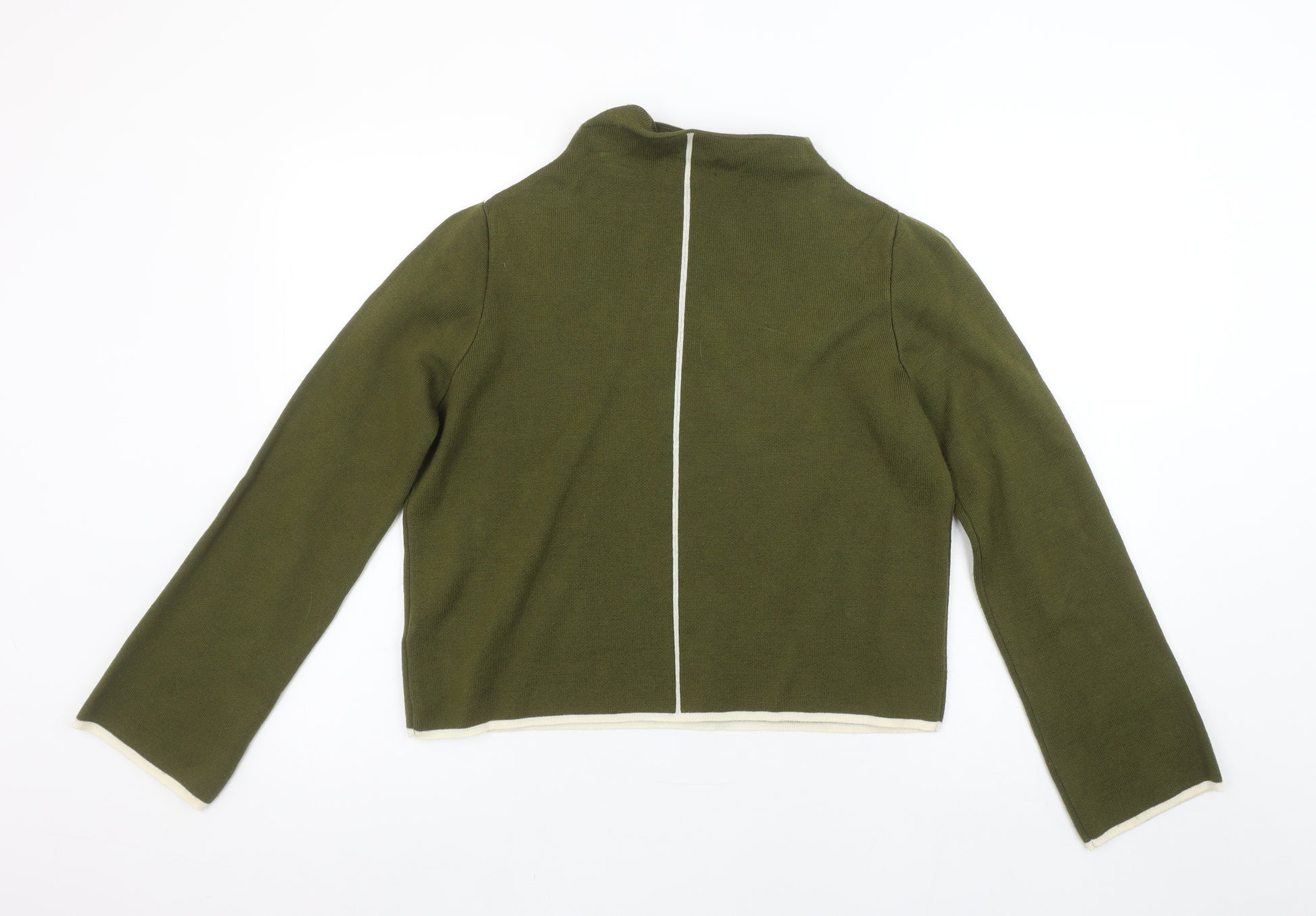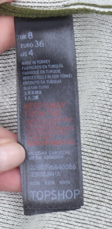 Elevate your wardrobe with this stylish green mock neck jumper from Topshop, a perfect piece for effortless modern dressing. Crafted from a soft blend of acrylic, viscose, and polyamide, this knit combines comfort with lasting quality. The fabric has a smooth, tight-knit finish that gives it a refined, structured look while remaining lightweight enough for versatile layering across seasons. Designed with a flattering mock neckline and full-length sleeves, it offers both warmth and style ideal for cooler autumn and winter days. The deep green shade adds a subtle yet striking tone that pairs beautifully with neutral hues or denim, making it a wardrobe staple for casual outings, relaxed weekends, or dressed-up evenings. The cropped fit and minimalistic trim detailing lend a contemporary edge, expressing the effortlessly chic aesthetic Topshop is known for. This piece can be easily dressed up with a midi skirt and boots or styled down with jeans and trainers for a laid-back look. Made in Turkey, this jumper showcases quality craftsmanship, offering both durability and a comfortable feel against the skin. In excellent pre-loved condition, it shows only light wear with no visible defects, maintaining its softness, shape, and colour vibrancy. Machine washable for easy care, this jumper is as practical as it is timeless. Whether you’re looking to refresh your knitwear collection or searching for the perfect stylish staple, this Topshop jumper is a fabulous choice to bring comfort and flair to your seasonal outfits. Ideal for layering under coats or wearing on its own when the weather turns mild, it’s a versatile piece you’ll reach for time after time. Add understated sophistication to your wardrobe and embrace the confident, contemporary look that Topshop delivers so well.