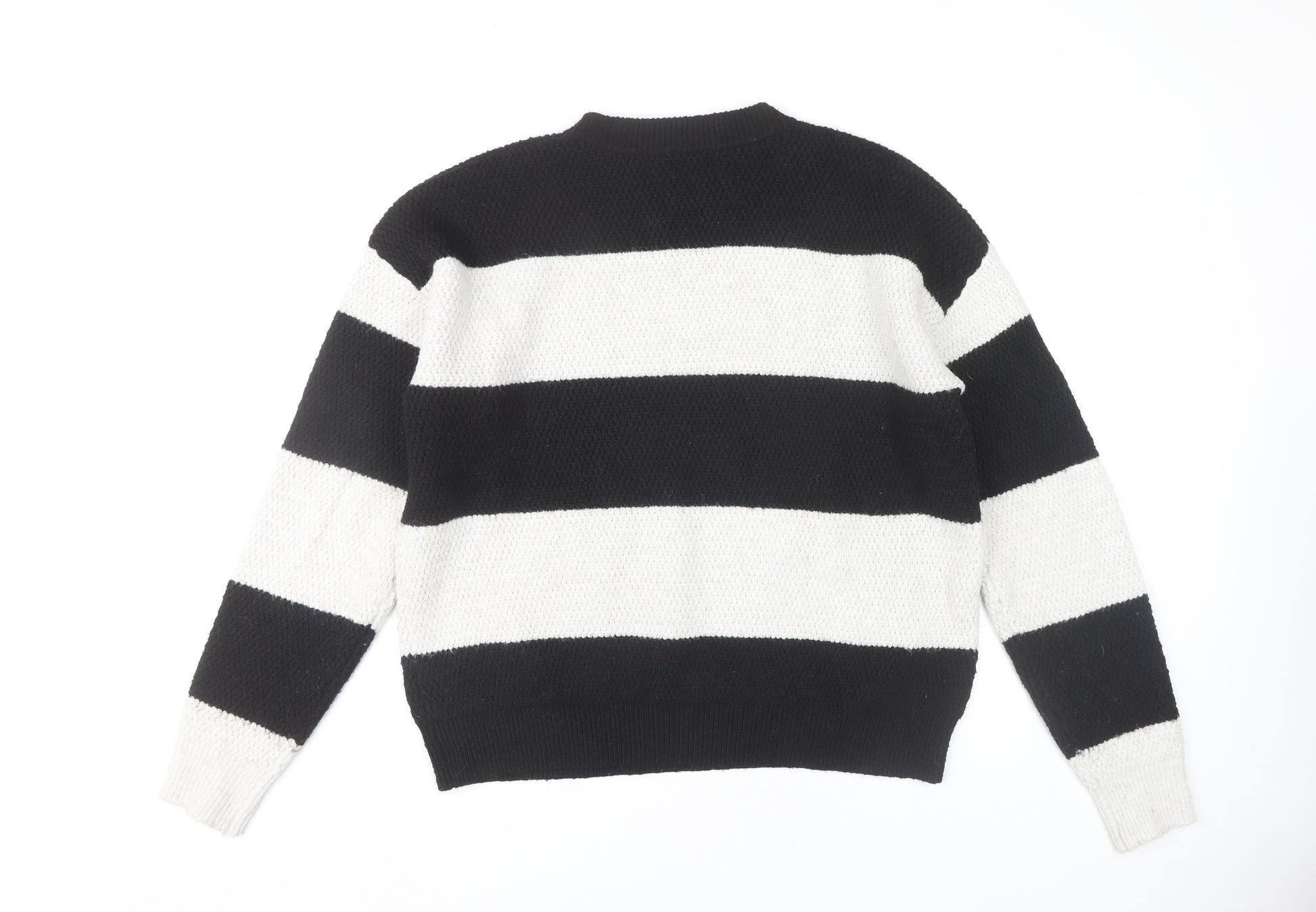Elevate your casual wardrobe with this Topshop women's pullover jumper. Featuring a striking black and white striped pattern, this jumper is perfect for making a bold statement. It's crafted for comfort and style in a relaxed fit, making it an ideal choice for casual outings or cosy days at home.With a crew neck design, this jumper exudes effortless style while ensuring maximum comfort. The chunky-knit style adds texture and warmth, perfect for cooler days. Made from a blend of polyester, acrylic, nylon, and elastane, this jumper offers durability and stretch, ensuring a comfortable fit that's easy to wear all day.The long sleeve design and pullover style make it easy to layer over your favourite outfits. Whether paired with jeans for a laid-back look or a skirt for a chic vibe, this jumper will be your go-to for versatile style options.Despite being pre-loved, it remains in excellent condition with no visible damage, promising a stylish addition to your wardrobe without compromising on quality. At a competitive price of £12.50, this Topshop jumper is a fantastic find for those seeking style and comfort.Don't miss out on this chance to add a touch of contemporary flair to your collection. Ideal for casual occasions, this jumper is not just a piece of clothing but a statement that embodies your unique style.