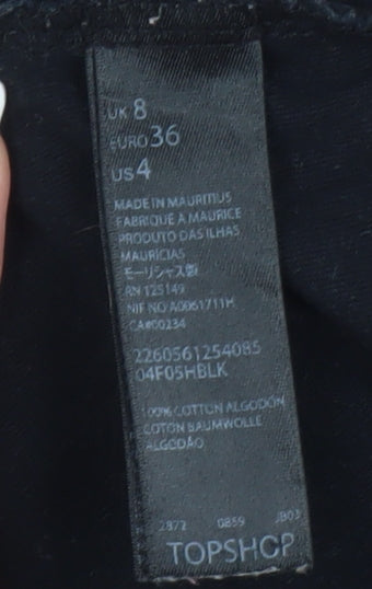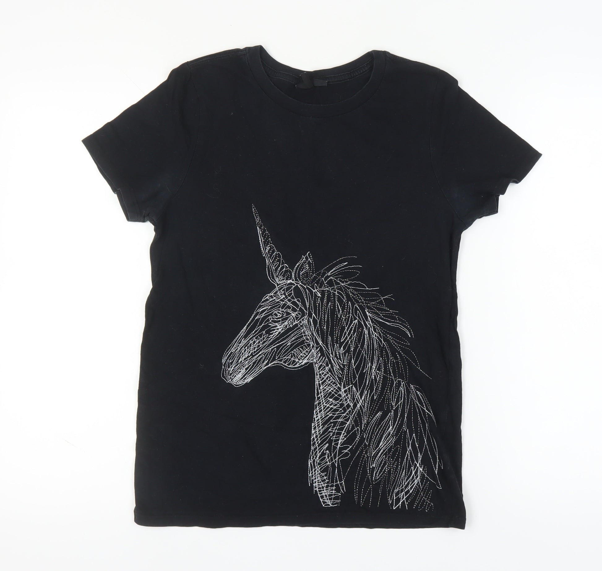 This stylish Topshop Women's T-Shirt in sleek black is a must-have for any casual wardrobe. Crafted from soft, breathable cotton jersey, it offers a comfortable fit perfect for everyday wear. The classic crew neck and short fitted sleeves provide a timeless silhouette, while the eye-catching unicorn print adds a whimsical touch, making it an ideal choice for those who love to express their unique style. Designed for regular fit in size 8, it's great for pairing with jeans or leggings for a relaxed and trendy look. Although in excellent condition, this pre-loved piece shows minimal signs of wear, free from tears or stains. Whether you're off to a casual outing or running errands, this T-shirt serves as a versatile piece that combines comfort with playful and modern flair. Embrace the charm of this unicorn-themed top and let your personality shine through effortlessly.