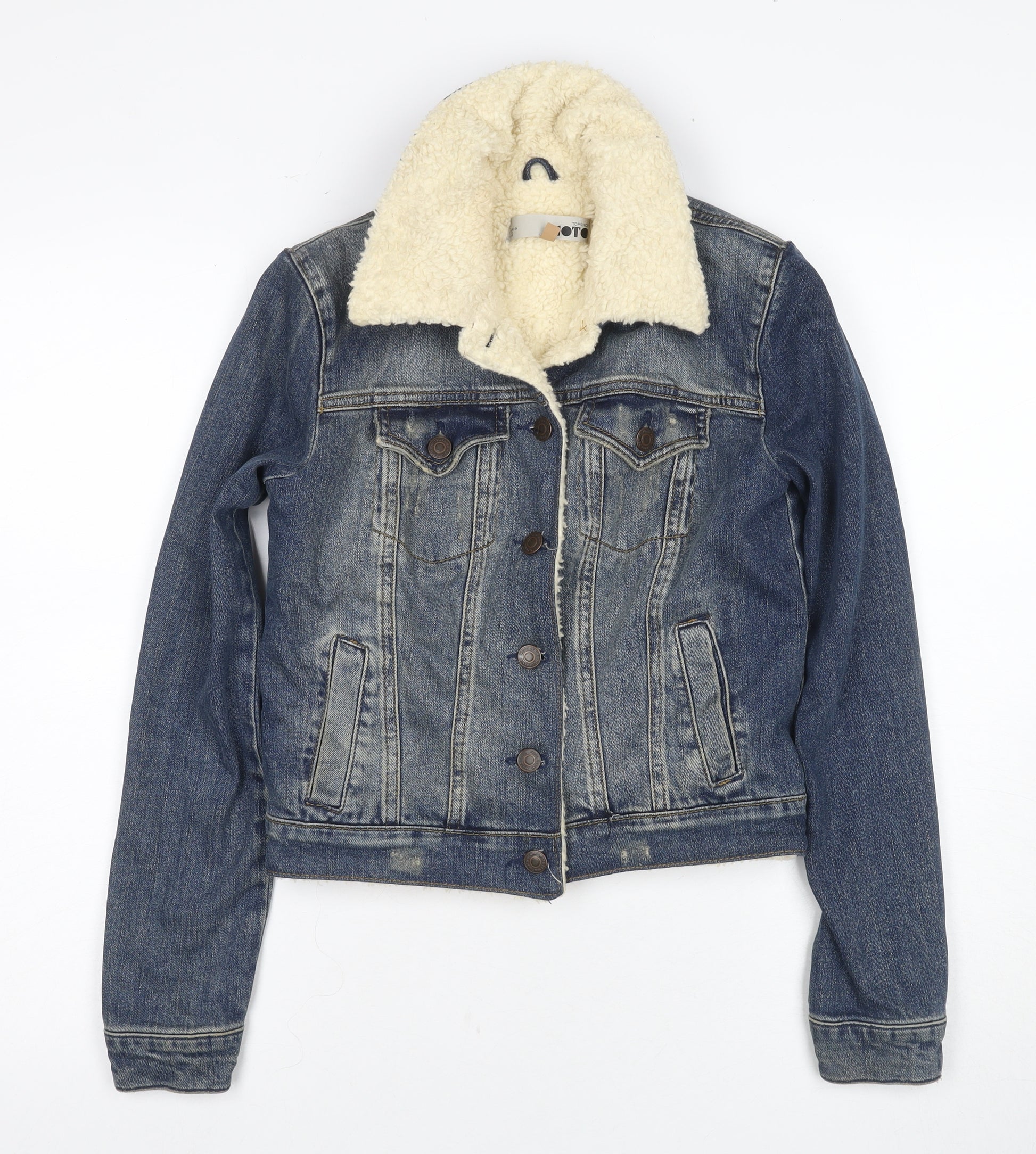 Embrace timeless style with this Women's Topshop Denim Jacket. Designed in a classic blue shade, this basic denim jacket features a flattering short length and is ideal for casual occasions. The cotton outer shell ensures comfort and durability, while the polyester lining provides added warmth, perfect for autumn and winter. The jacket is adorned with button accents and has a button closure, adding to its classic appeal. Lined for comfort, this jacket is a staple piece for any wardrobe, offering a versatile option that's easy to style. Despite being pre-owned, the jacket is in excellent condition, ensuring you'll look stylish season after season.