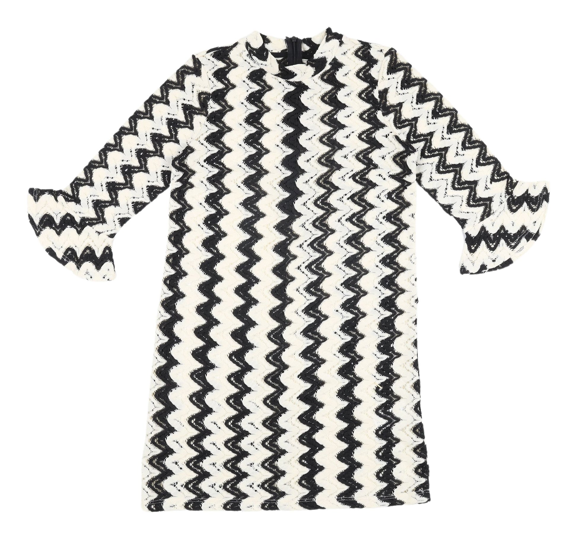 Embrace style and elegance this season with this stunning women's shift dress from Topshop. Featuring a bold chevron pattern in a chic black and white multicoloured design, this knee-length dress offers both comfort and flair. Made from 100% polyester lace, it provides a lightweight and breathable experience, perfect for both spring and summer occasions. The dress boasts an elegant crew neckline, complemented by flared 3/4 sleeves that add a touch of retro charm. A practical zip closure ensures an easy fit, while the fully lined design enhances overall comfort. Designed for party or cocktail events, it’s an excellent choice for any woman seeking a stylish wardrobe addition. Easy to care for with machine washability, this dress is ideal for modern fashion enthusiasts.