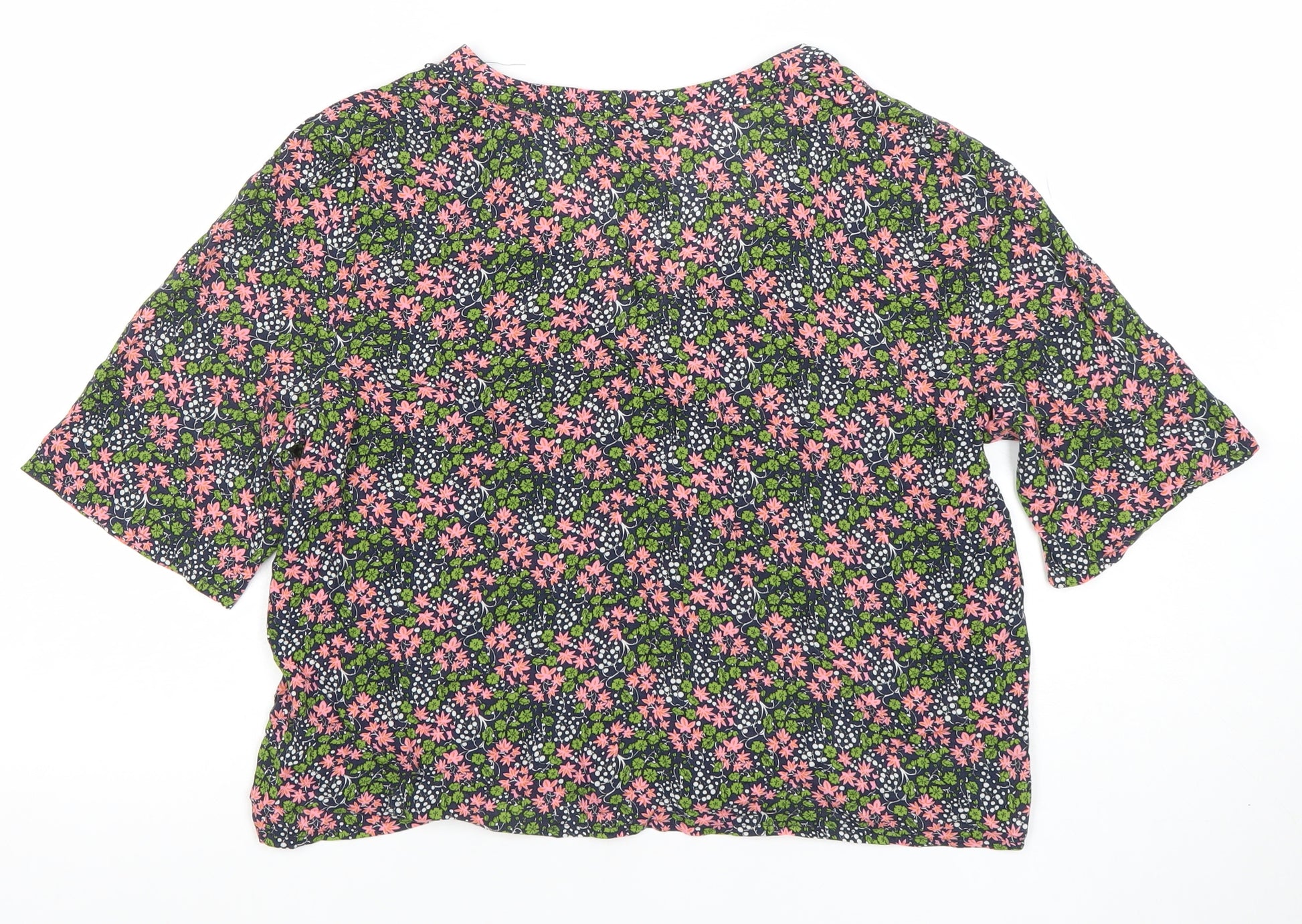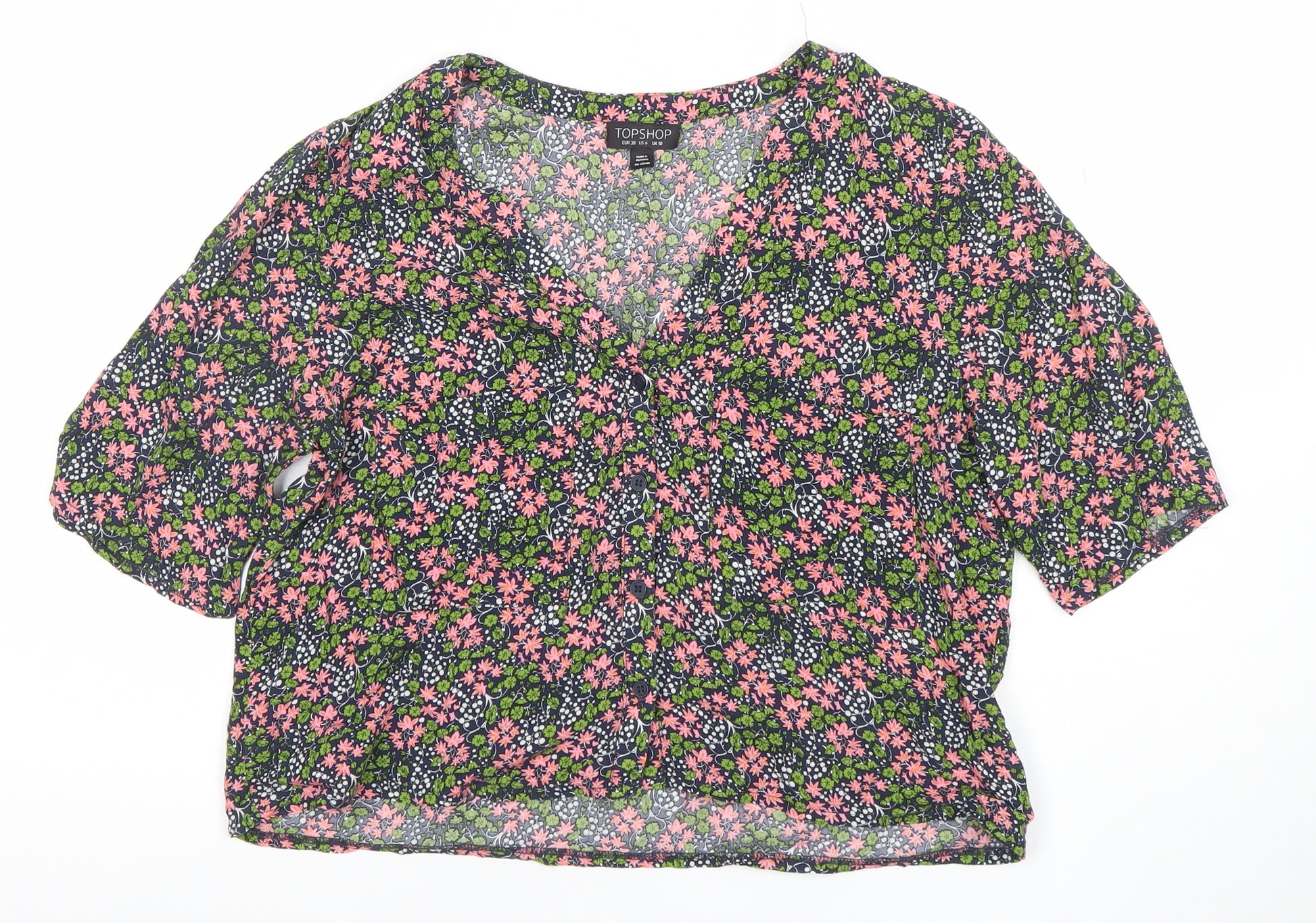 Add a refreshing pop of floral charm to your wardrobe with this delightful Topshop women's blouse. In a standout multicoloured floral design, this light and breezy top offers a modern cropped silhouette perfect for warmer days or layering under jackets. Crafted from 100% viscose, it feels soft, lightweight, and breathable on the skin, ensuring comfort throughout the day. The woven fabric drapes beautifully, adding a flattering touch to the relaxed fit. Featuring a graceful V-neckline and short classic sleeves, the blouse brings a feminine yet effortless style suitable for casual occasions, brunch dates, garden parties or weekend strolls. The button-down front accent adds subtle detailing while maintaining the blouse’s clean and versatile design. With its classic shape and modern cropped cut, it pairs wonderfully with high-waisted jeans, skirts, or tailored trousers, making it an easy styling favourite. The vibrant combination of pink and green flowers against a dark background ensures this piece stands out without being overpowering. Ideal for spring and summer wear, it keeps you cool while expressing an individual sense of style. Designed for women who appreciate fashionable yet comfortable pieces, this blouse promises to complement many outfits and provide long-lasting wear. Conditioned in excellent used state, this garment shows no visible flaws, marks, or repairs, ready for its next stylish wearer. Whether dressing up for a casual lunch or adding flair to your daytime look, this Topshop cropped floral blouse will bring a touch of playful femininity to your collection. A perfect blend of comfort, quality, and effortless chic, making it a piece you’ll love to wear season after season.