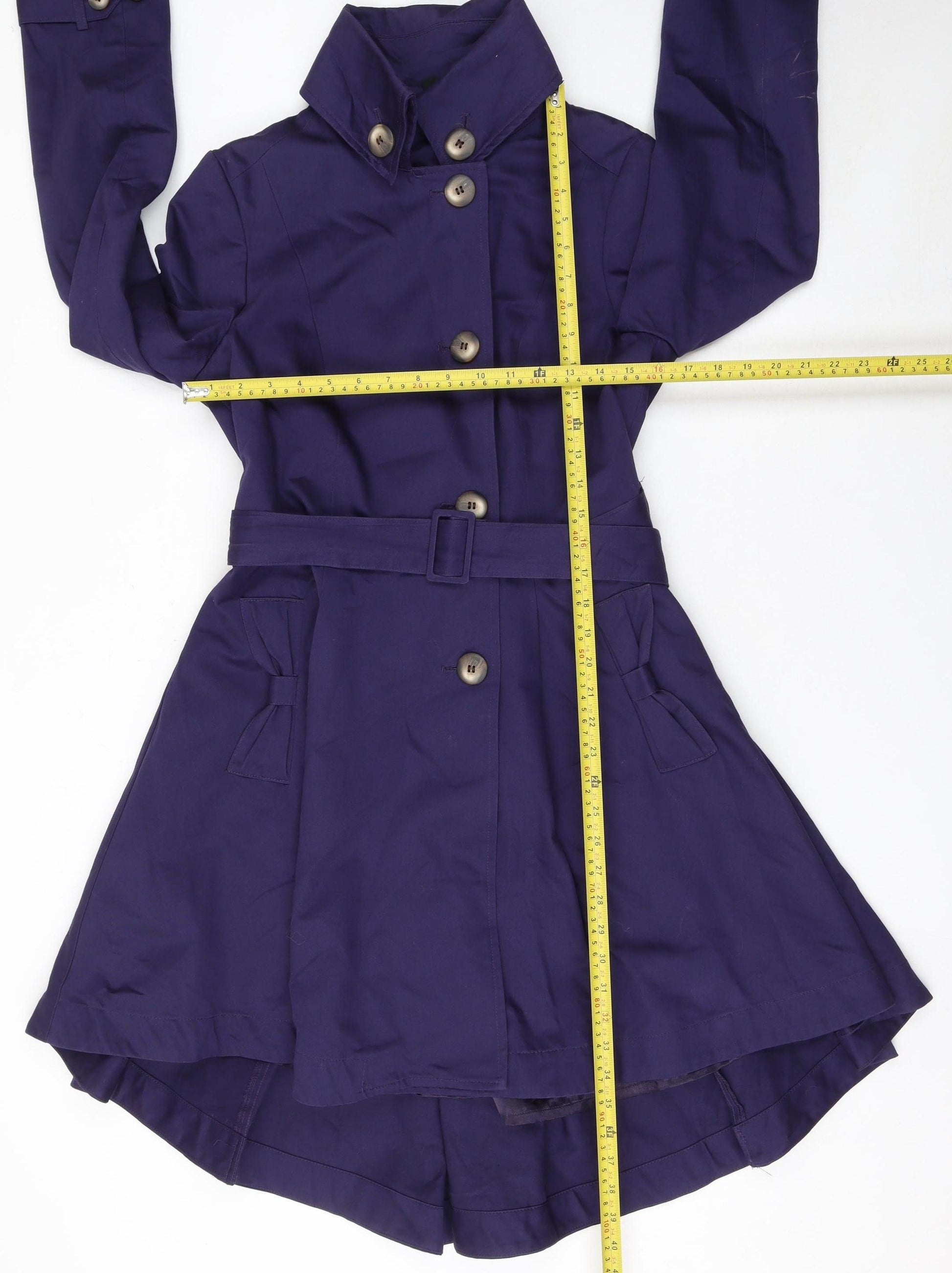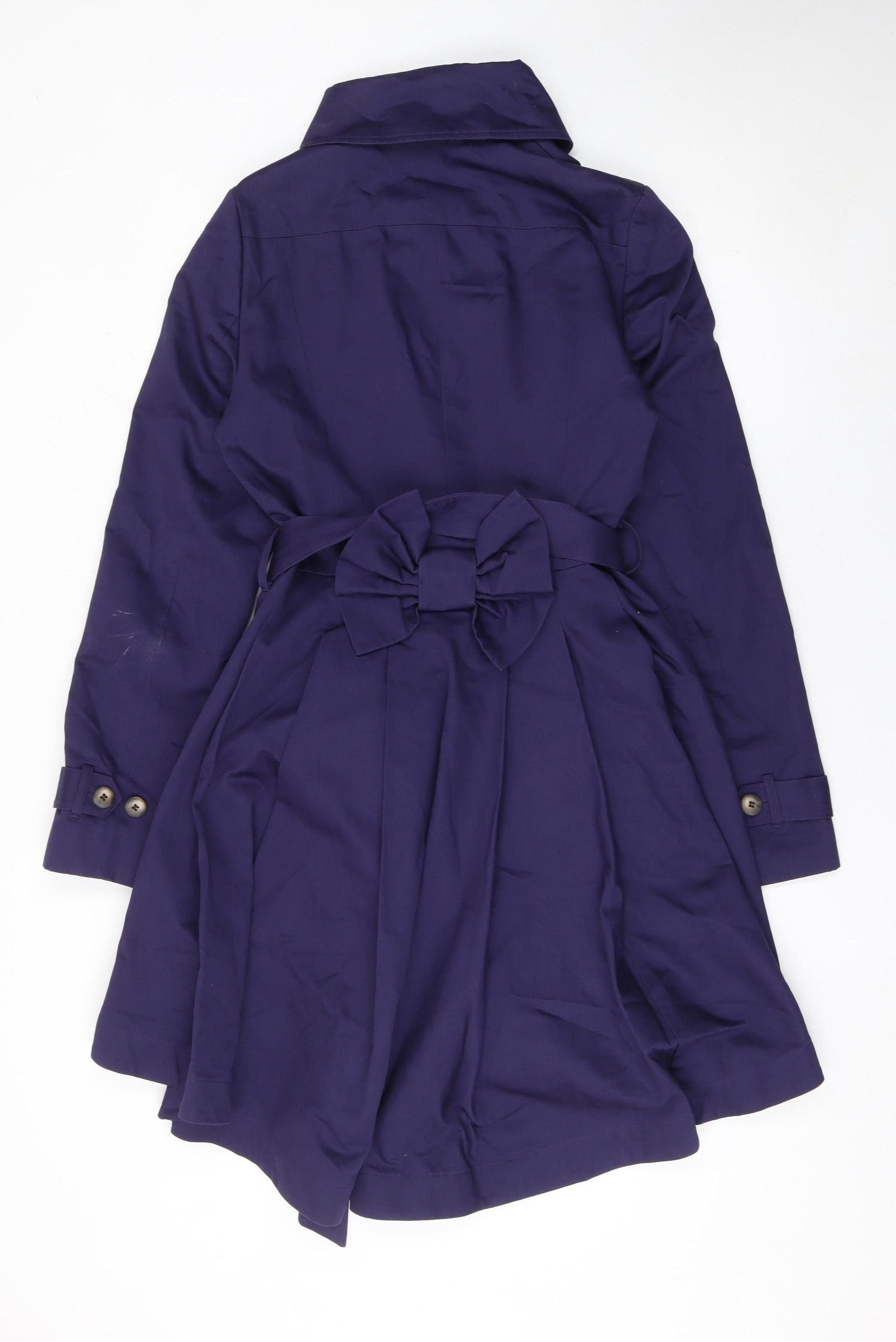 Elevate your look with this elegant Topshop women’s purple trench coat, a timeless piece designed for both style and practicality. Crafted from 100% cotton, the coat offers breathable comfort and a smooth, structured silhouette, making it perfect for transitional seasons such as spring and autumn. The mid-length cut gives a flattering shape that enhances any outfit, whether dressed up for work or paired casually with jeans for a relaxed weekend outing. A belted waist cinches the figure for a classic feminine fit, while the front button fastening and collared neckline add sophistication and versatility. Subtle details such as the decorative back bow accent give this coat a unique, fashion-forward touch, blending modern charm with retro elegance. The coat also features lined interior construction for added comfort and a polished look from the inside out. Its deep purple colour adds a pop of confident colour to your wardrobe, complementing both neutral and bold tones. Functional side pockets provide convenience, ensuring you can keep essentials close while on the go. The cotton twill fabric enhances durability while maintaining a soft yet structured finish, perfect for light layering in cooler months. Although gently worn, it remains in very good condition with only minor marks visible, preserving both quality and appearance. This Topshop trench coat is ideal for everyday wear, business casual occasions, or travel, where comfort and style matter equally. Pair it with boots and a scarf for an effortlessly chic seasonal look or add trainers and denim for laid-back sophistication. A coat that bridges style and function, it’s a wardrobe staple that ensures you’re always dressed to impress — combining British tailoring tradition with contemporary urban flair. Its enduring design ensures it will remain a favourite for years to come.