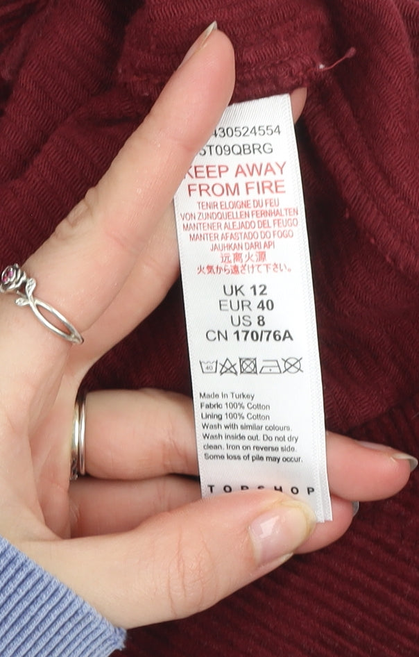 Elevate your everyday style with this stunning women's red corduroy mini skirt from Topshop, designed in a flattering straight fit that delivers both comfort and modern appeal. Crafted entirely from high-quality cotton, this skirt offers softness, breathability, and durability, making it a versatile piece for seasonal wardrobes. The deep red hue adds a warm and rich tone, perfect for autumn and winter outfits, while the soft corduroy fabric lends a textured touch that’s effortlessly chic. Featuring functional front and back pockets, this skirt is as practical as it is stylish — ideal for pairing with tucked-in knits, crisp blouses, or a casual tee. The mid-rise waist ensures a comfortable fit that flatters the silhouette, while the zip and button closure provide a classic finish. Designed for ease of care, this skirt is machine washable for everyday convenience. The casual yet refined design makes it perfect for relaxed weekends, outings, or smart-casual work days. Though gently used, it remains in very good condition with clean fabric and only minimal signs of wear, ensuring it still looks fantastic. Add a touch of retro charm to your collection with this timeless Topshop piece — a wardrobe essential that combines elegance and practicality. Pair effortlessly with ankle boots and a chunky jumper for a cosy look, or dress it up with tights and heeled boots for a more polished appearance. Rediscover the charm of corduroy with this comfortable skirt that embodies everything about laid-back sophistication.