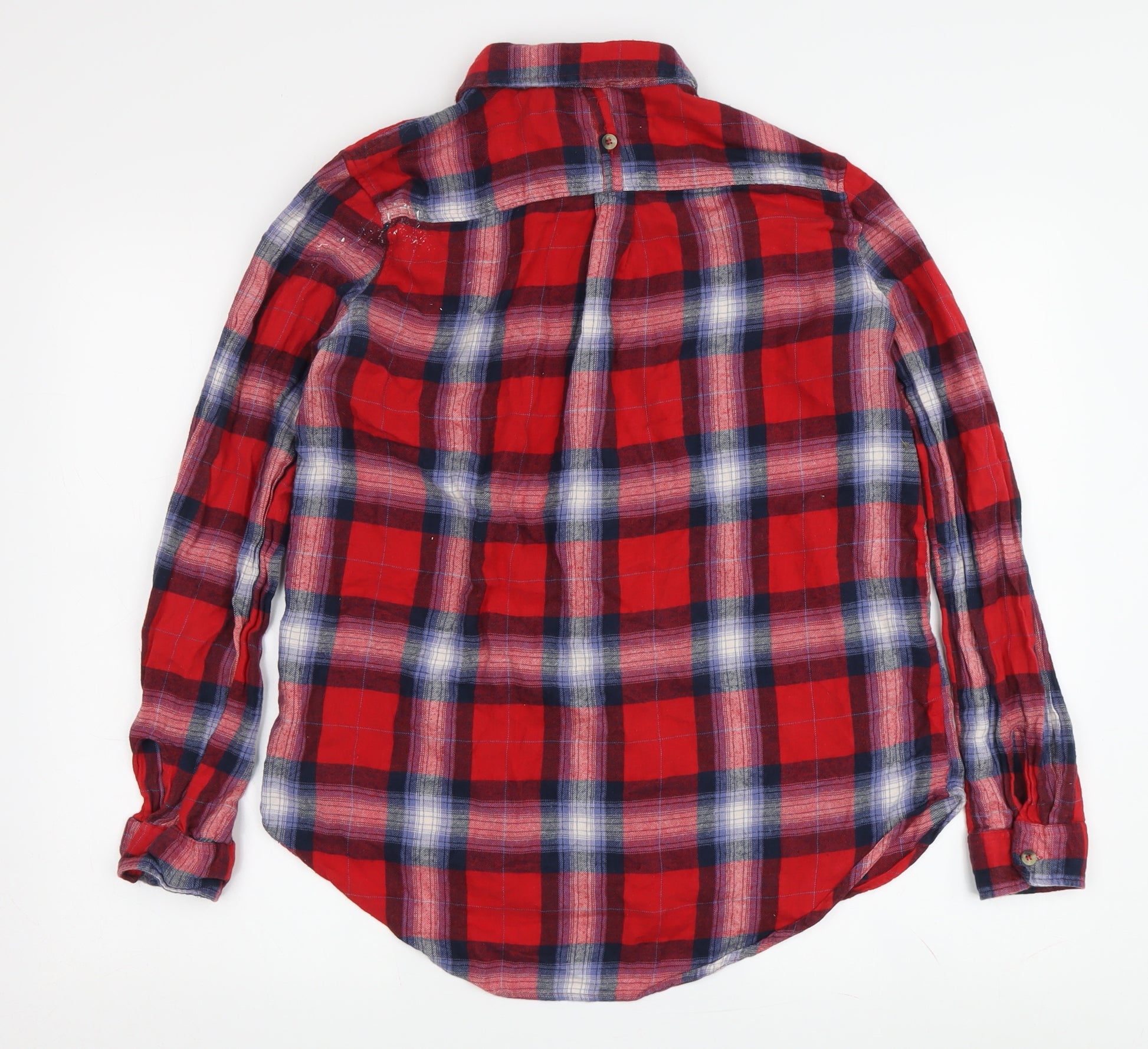 Step into casual elegance with this Topshop Women's Red Plaid Button-Up Shirt in Size 10, designed to seamlessly blend style with comfort. Crafted entirely from soft cotton, this collared long sleeve shirt is perfect for those chilly autumn and winter days. The classic red plaid pattern exudes charm and versatility, making it an ideal choice for a casual outing or a relaxed day at home. Thanks to its button closure, this shirt offers a snug regular fit, giving you a tailored look without sacrificing comfort. Though showing minimal wear on the shoulder, its condition remains very good, assuring style and quality. Easy to care for with machine washability, this shirt embodies convenience without compromising on fashion. Add a touch of plaid panache to your collection and let it become a staple in your wardrobe.