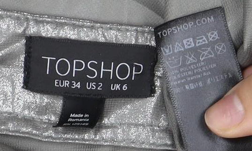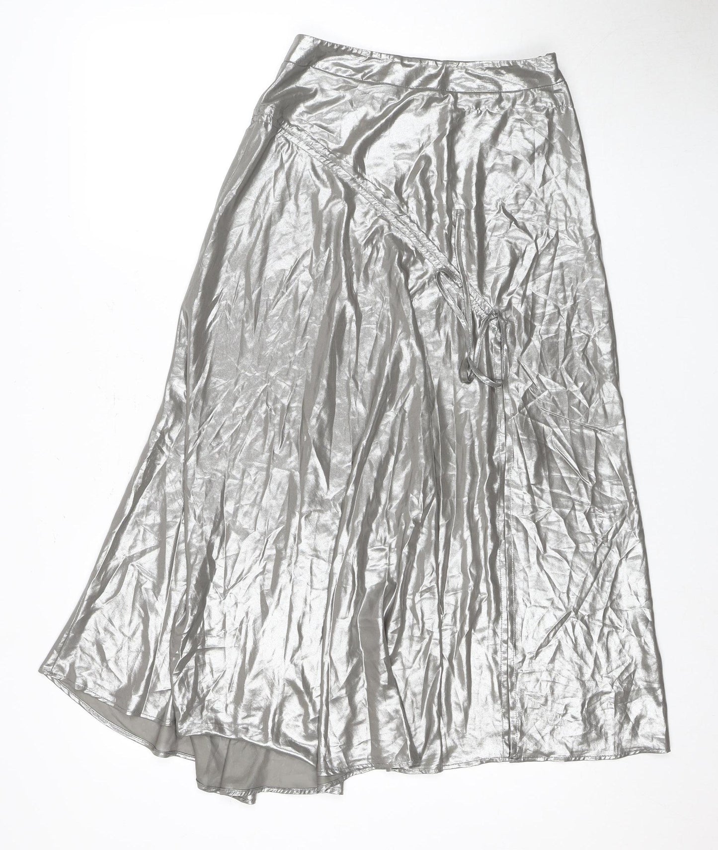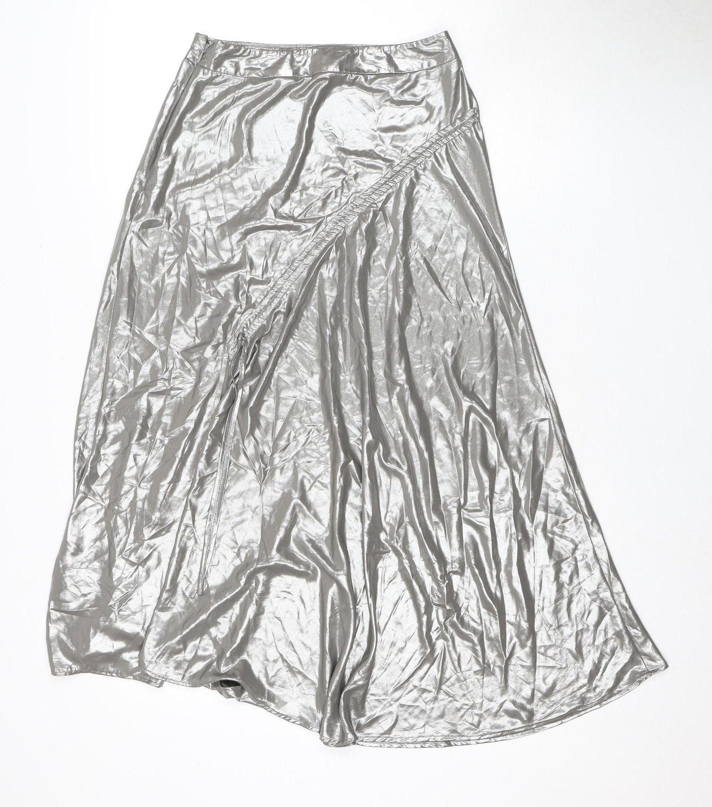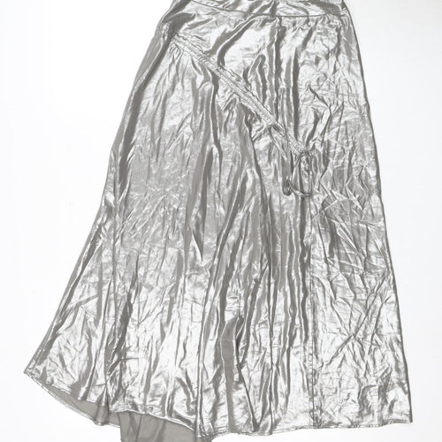 Elevate your wardrobe with this striking Topshop Women's Silver Long Skirt, designed to add a touch of glamour to your ensemble. This luxurious skirt in a metallic silver hue is both chic and timeless, perfect for making a statement at any event. Crafted from 100% Polyester, it boasts a shiny finish that catches the light beautifully, ensuring you stand out at parties and cocktail events. Its lightweight nature makes it comfortable to wear through the crisp days of Autumn and the chilly nights of Winter. While the absence of patterns keeps it elegant, the long flowing silhouette ensures it drapes gracefully, moving with you effortlessly. Although the condition is marked as excellent, the skirt does have a naturally wrinkled appearance, contributing to its unique character and style. Ideal for pairing with a simple top or blouse, this skirt can transition seamlessly from casual outings to more formal gatherings. The regular fit is designed for ease, complementing a range of figures. It's easy to maintain with its hand wash only care instructions, ensuring longevity in your collection. Don't miss the chance to add this versatile piece to your closet — an elegant choice for anyone looking to indulge in a silver metallic trend.