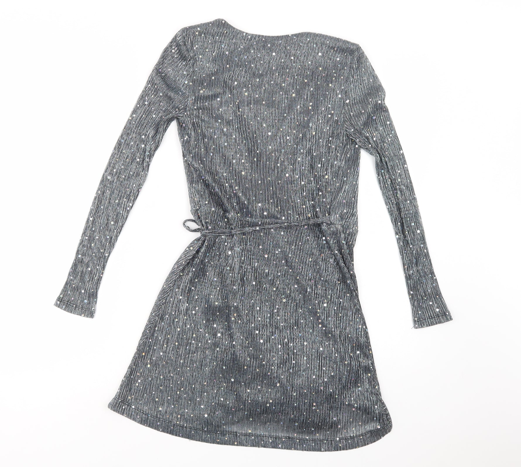 Womens Silver Polyester Wrap Dress Size 6 V-Neck Tie