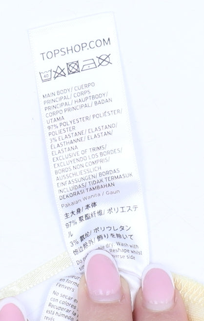 Embrace the charm of sunny days in this delightful yellow slip dress from Topshop, perfect for casual outings in spring and summer. This women's slinky number features a soft, woven fabric blend of polyester and elastane, ensuring a comfortable fit that you'll love to live in. With its playful check pattern and strappy sleeves, this dress radiates easy-going style. The scoop neckline and bow tie closure at the back add a touch of femininity, making it a versatile addition to your wardrobe. Pair it with sandals for a relaxed daytime look or dress it up with heels and accessories for dinner dates. Machine washable for easy care, this dress offers practicality alongside fashion-forward design. Whether you're heading to the beach or exploring a new city, this dress is your go-to for effortless elegance. Available in a regular size 10, this piece is perfect for those seeking a balance of style and comfort. Experience the joy of fashion that not only feels good but looks great too.