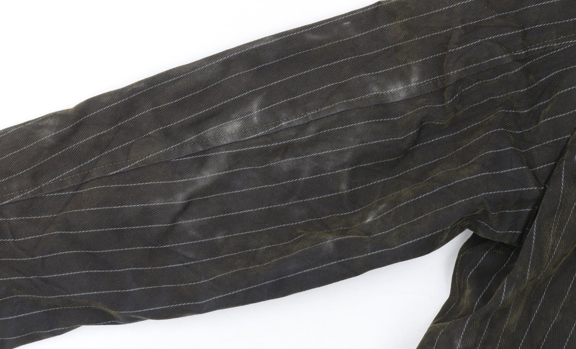 This Tornado Mart men's brown pinstripe coat is a refined piece of outerwear that combines understated style with quality craftsmanship. Made from 100% cotton twill, it offers a smooth, durable texture and a classic pinstripe pattern that adds a subtle touch of sophistication. The jacket features a mid-length cut, single-breasted button closure, and a smart pointed collar for a timeless and versatile look suitable for both casual and semi-formal settings. Fully lined in polyester, it provides comfort and structure while maintaining a crisp silhouette. With practical front pockets and buttoned cuffs, this coat balances function and design effectively. The rich brown tone with fine vertical stripes gives it an elegant contrast that pairs effortlessly with jeans, chinos, or formal trousers, making it ideal for autumn and winter wear. The coat’s regular fit ensures a comfortable and flattering shape for various body types, while its structured tailoring lends it a smart, contemporary edge. Although in very good pre-owned condition, there are faint signs of wear and light marks on the sleeves consistent with gentle use. This premium overcoat offers exceptional value and a distinctive look for the discerning dresser who appreciates fine detailing and Japanese craftsmanship. Designed for those who prefer versatile layering options, it transitions seamlessly between business meetings, weekend outings, and evening events. A stylish, durable, and distinctive piece that enhances any wardrobe.