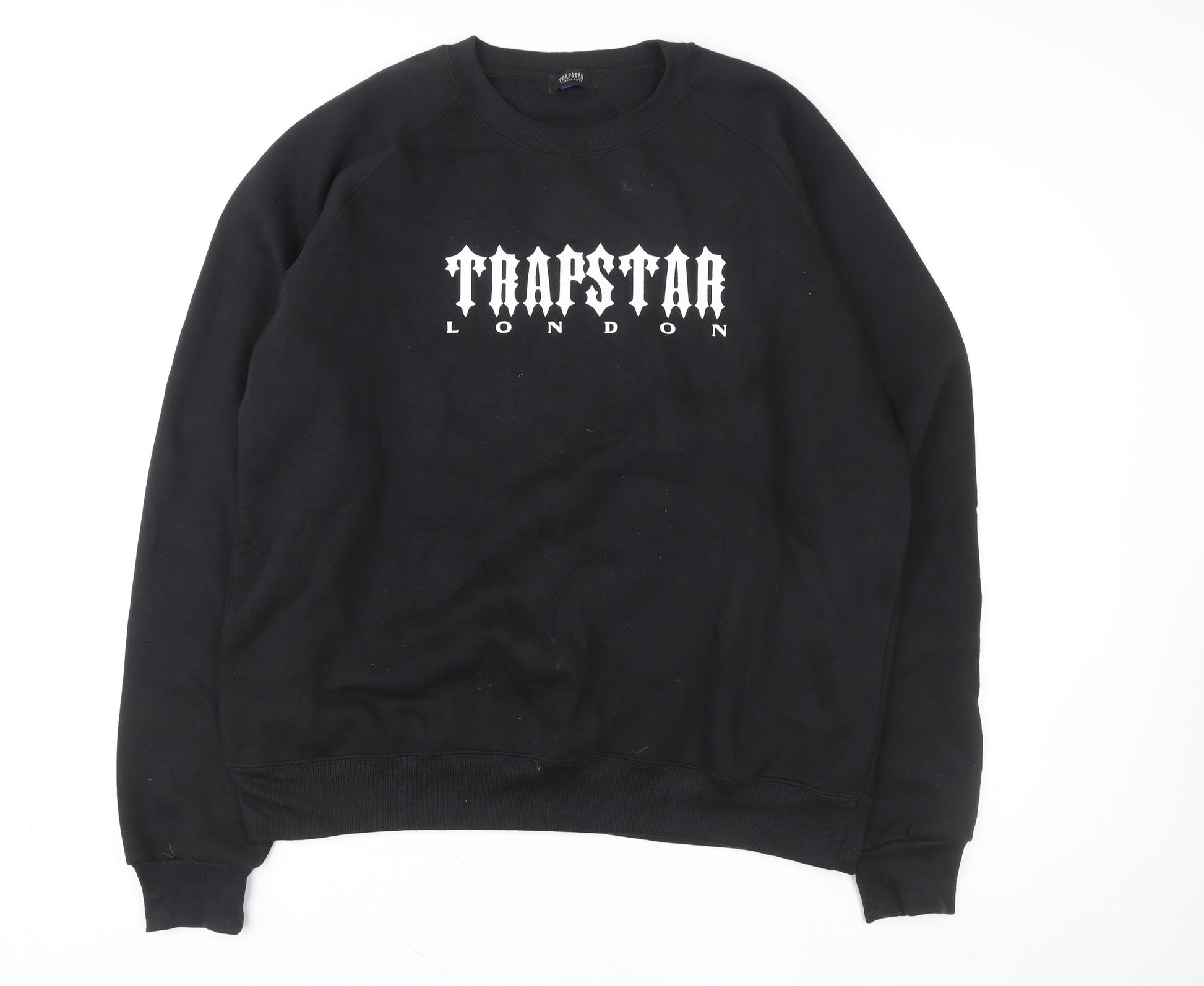 Upgrade your casual rotation with this Trapstar men's black sweatshirt, an urban essential that effortlessly combines comfort, street-ready aesthetics, and premium quality. Crafted from a soft and durable blend of 50% cotton and 50% polyester fleece, this pullover provides lasting comfort and warmth, ideal for cooler autumn, winter, and spring days. The classic crew neck design complements long sleeves and ribbed cuffs and hem for a snug, structured fit that sits well over t-shirts or under a coat. The bold white 'Trapstar London' graphic logo on the front stands out against the black base, adding an unmistakable streetwear statement. Perfect for those who appreciate distinctive style and minimalist detail, it features quality stitching and soft fleece lining for everyday wear. The breathable, machine-washable fabric ensures easy care while maintaining its original shape and comfort. Designed in a regular fit, it provides ease of movement without feeling oversized or restrictive. Whether paired with jeans, joggers, or cargo trousers, this Trapstar sweatshirt adds a modern edge to any outfit. Versatile enough for everyday errands, relaxed weekends, or laid-back social occasions, it’s the ultimate blend of fashion and functionality. In very good pre-owned condition with only light signs of wear, it offers great value and longevity. Add this authentic Trapstar pullover sweatshirt to your wardrobe and embrace a sleek urban look with unbeatable comfort and distinctive branding—ideal for men seeking both practicality and contemporary appeal.