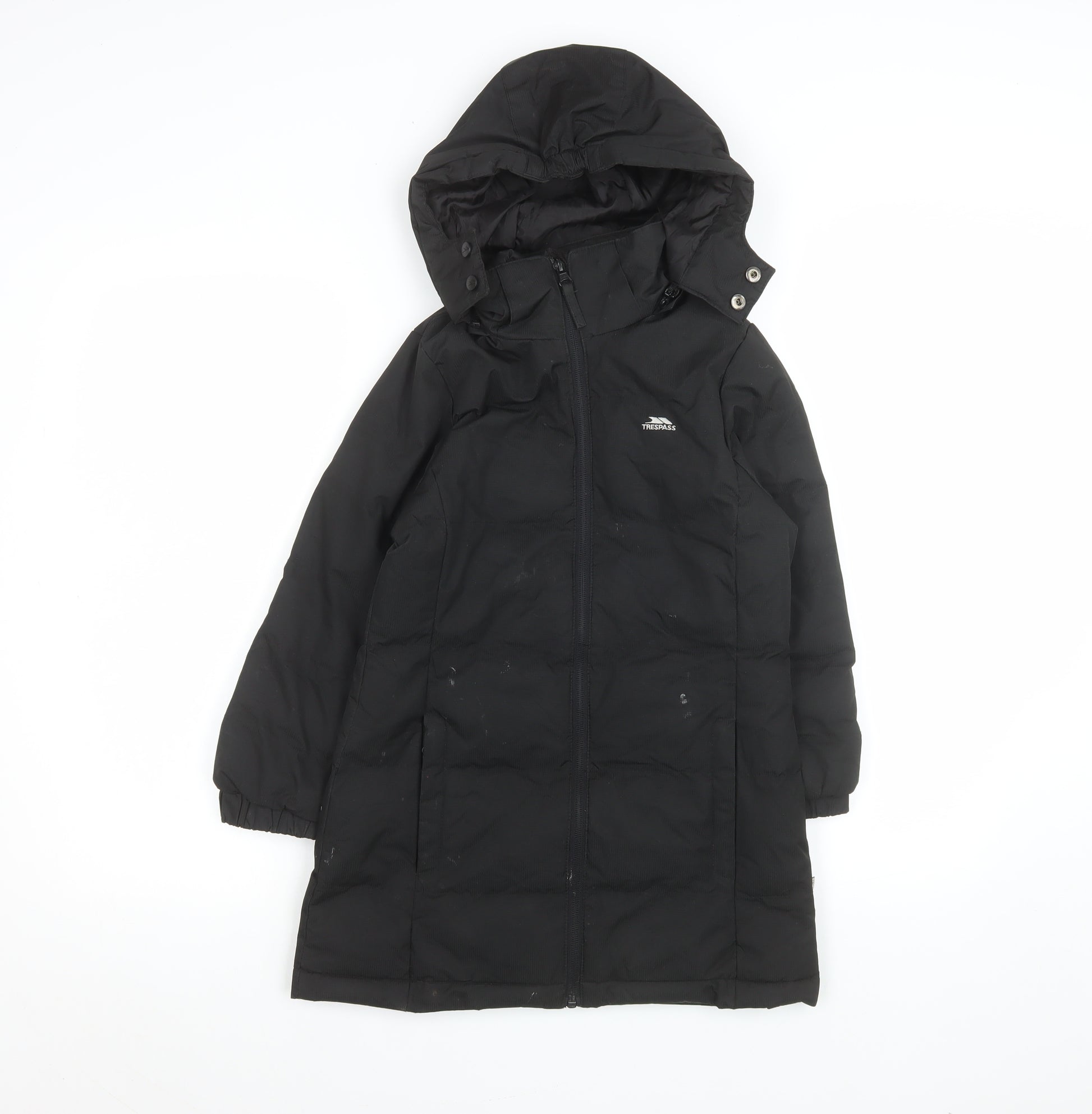 Keep your little one warm, dry and comfortable with this Trespass Girls Black Waterproof Hooded Long Puffer Coat, perfect for everyday winter wear. Designed by the outdoor specialists Trespass, this technical performance coat (TP50 rated) offers both waterproof and windproof protection up to 2000mm, ensuring reliable resistance against cold and wet conditions. The coat features a sleek, classic black colourway that easily pairs with any outfit, making it a practical yet stylish choice for outdoor adventures, school days, or weekend walks. Crafted from 100% polyester, the outer shell provides a durable yet lightweight barrier against the elements, while the fully lined interior adds a soft insulating layer for extra warmth. The coat’s synthetic padding ensures excellent thermal retention without added bulk, and the longline design provides full coverage to keep out the chill. Functional details include a full-length front zip closure, an attached hood with popper fastenings, and side pockets ideal for keeping hands warm or holding small essentials. The elasticated cuffs help lock in heat, while the subtle silver Trespass logo accents the chest for a signature finish.This coat’s machine washable care instructions make maintenance simple, perfect for parents looking for a low-fuss garment that withstands active use. Despite some minor surface marks indicative of gentle wear, the jacket remains in very good pre-loved condition with plenty of life left. Ideal for use during autumn and winter months, this versatile and dependable coat offers both weather protection and everyday comfort.Whether your child is heading to school, playing outside or accompanying you on crisp morning walks, the Trespass Girls Black Waterproof Hooded Long Puffer Coat provides trustworthy warmth and style combined with tried-and-tested outdoor performance. A must-have wardrobe staple for the colder seasons.