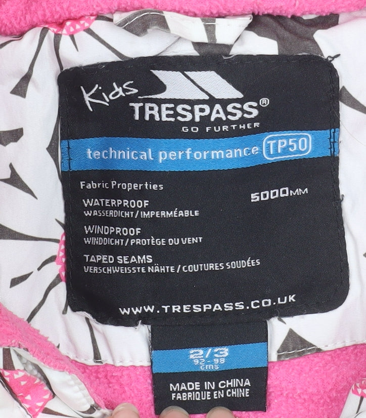 Keep your little one warm and stylish with this lovely Trespass Girls Multicoloured Floral Hooded Waterproof Puffer Jacket in size 2-3 Years. This jacket is designed for outdoor adventures and everyday play, combining both function and fashion. Featuring a fun, eye-catching floral print with white, brown, and pink tones, it’s perfect for brightening up gloomy autumn and winter days. The durable polyester outer shell provides protection against wind and rain, ensuring your child stays dry and comfortable. With a waterproof rating of 5000mm and taped seams, this jacket effectively shields from wet weather while remaining breathable for comfort. The windproof design further enhances warmth and protection from the chill. Inside, the pink fleece lining adds cosy softness, ideal for colder days. The full-length zip closure makes dressing easy, while the elasticated cuffs help keep extra warmth in. The hood offers added coverage during rainy walks or school commutes. Designed for regular fit and made from long-lasting woven polyester fabric, this practical jacket is perfect for casual, activewear, and everyday use such as school days, family outings, or exploring outdoors. Although pre-owned, it remains in very good condition with only light general wear and no visible damage. The jacket does not come with original sales tags. Machine washable for convenience, it’s a fantastic, easy-care choice for parents. Ideal for seasons including autumn and winter, it blends comfort, durability, and charming style. Give your child a dependable, cheerful outerwear option with this Trespass waterproof puffer jacket that will make any day out more enjoyable, no matter the weather.