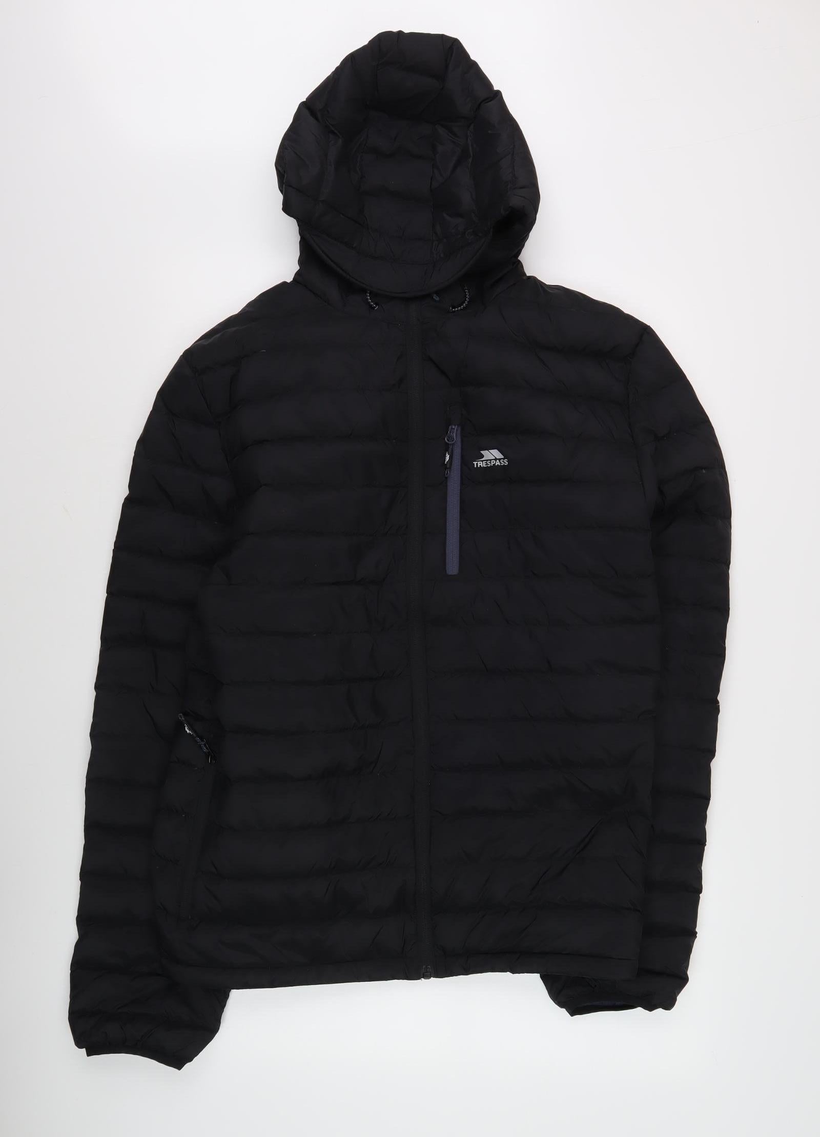 Stay warm and stylish with this Trespass men's puffer jacket, meticulously designed for the colder seasons of autumn and winter. Tailored in a classic black finish, this jacket is perfect for everyday casual wear, offering both comfort and functionality. Made from high-quality polyester, it features a mid-length design providing extra coverage against the chill. The jacket includes a hood for added protection against the elements, making it a fantastic choice for outdoor activities.Inside, the lining ensures you stay insulated and comfortable throughout the day. It is filled with natural down, promoting excellent warmth-to-weight ratio, ensuring you stay cosy without the bulk. The jacket's design includes practical features such as a full zip closure and multiple zipped pockets for secure storage of essentials. Branding accents add a touch of identifiable style, while its lightweight and compressible construction allows for easy packing when on the go.Ideal for men who are active yet fashion-conscious, this Trespass jacket offers both technical performance and timeless style. Its regular fit and staple design make it versatile enough to pair with any outfit, from casual jeans to more formal outdoor attire. This jacket is not only machine washable for easy care but also free from visible signs of wear, reflecting its excellent condition. Perfect for those weekend hikes, city adventures, or the daily commute, this piece ensures you remain warm and prepared, embracing the colder weather in style.