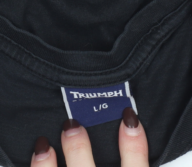 Embrace timeless British style and casual comfort with this Triumph Men's Black Cotton Graphic T-Shirt in size L. Crafted from 100% soft, breathable cotton, this short-sleeved tee provides a comfortable fit ideal for everyday wear. The classic crew neckline and regular cut make it a versatile wardrobe staple, perfect for pairing with jeans, joggers, or shorts. The front showcases the iconic Triumph logo in bold green lettering, reflecting the brand’s legendary motorcycle heritage and modern lifestyle appeal. Its understated black colourway ensures easy outfit coordination, giving you a smart yet laid-back look suitable for both casual outings and relaxed evenings. The lightweight jersey fabric enhances comfort while maintaining shape wash after wash. Designed for all-day wear, this T-shirt stands out through its clean finish, simple construction, and authentic Triumph branding. Machine washable for convenient care, this piece carries both durability and timeless fashion sensibility. Ideal for fans of classic motor culture, enthusiasts of simple and stylish menswear, or anyone seeking a premium-quality casual tee. Its breathable cotton construction ensures cool wear, making it perfectly suited for spring, summer, and autumn months. Whether you are heading out on the open road or enjoying a day off, this Triumph T-shirt blends rugged charm with modern comfort. Excellent pre-owned condition reflects minimal signs of light wear, keeping the shirt looking fresh and well-maintained. A brilliant addition to any casual rotation, offering quality craftsmanship and heritage styling at an affordable price. Add this authentic Triumph T-shirt to your collection for effortless style that celebrates both comfort and character.