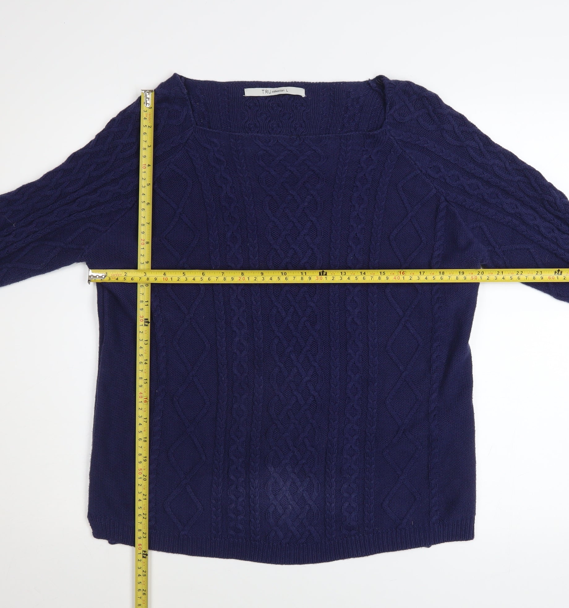 Refresh your wardrobe with this lovely women's blue cable-knit jumper from TRU Collection. Crafted from 100% cotton, the jumper is soft, breathable, and ideal for layering throughout the cooler months. The rich navy-blue tone gives it an elegant yet versatile appeal, suitable for pairing with jeans, skirts, or tailored trousers. Designed in a classic pullover style, it features a flattering boat neckline that gently frames the shoulders and neck, giving a refined, feminine touch. The three-quarter-length raglan sleeves enhance comfort and ease of movement, making it a great choice for casual days or relaxed workwear settings. The intricate cable-knit pattern adds texture and visual interest, while the ribbed cuffs and hem provide a neat, durable finish. Perfect for autumn, spring, and winter wear, this jumper can be effortlessly styled for both home and outings. With its high-quality knitted cotton construction, this piece offers lasting comfort and is machine washable for easy care. The relaxed regular fit ensures it flatters a wide range of body shapes without compromising on style. This TRU Collection jumper is in excellent pre-owned condition with no visible flaws and minimal signs of previous wear, ensuring its next owner enjoys both quality and style at a great price. Whether you're looking for a cosy everyday knit or a smart casual option for layering, this versatile piece will quickly become a wardrobe favourite. Ideal for casual occasions, weekend wear, and layered winter looks, the TRU Collection cotton cable-knit jumper combines style, comfort, and practicality for effortless everyday dressing.