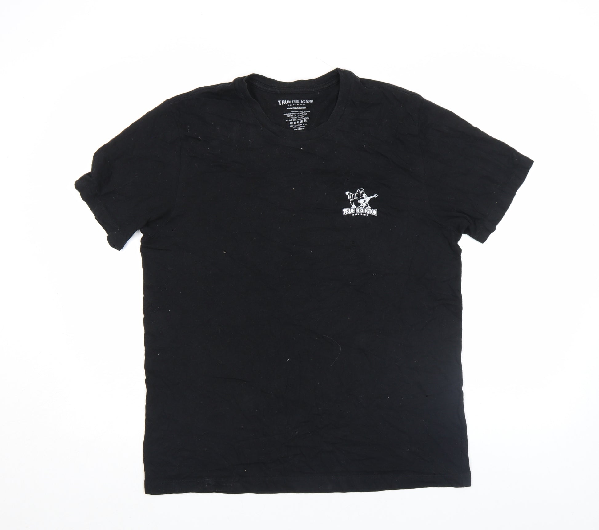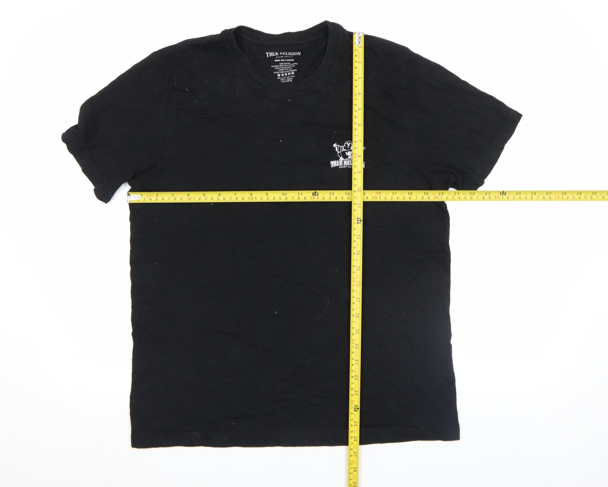 Add a stylish edge to your wardrobe with this True Religion men's black graphic T-shirt. Crafted from 100% soft cotton jersey for lasting comfort, it delivers premium quality with a laid-back, urban feel. The shirt features a classic crew neckline, short sleeves, and a bold True Religion branded music-themed graphic print on the back, showcasing an iconic figure holding a guitar against a retro sunset background. Perfect for everyday wear, this regular-fit tee suits casual outings, gigs, or weekend getaways. The breathable cotton material ensures comfort all day, while the lightweight design makes it ideal for layering or wearing on its own across spring, summer, and autumn seasons. Its chest logo print and stylish contrast graphics add a standout touch without compromising on simplicity. The shirt is machine washable for easy care and retains its shape wash after wash. Although pre-owned, it remains in very good condition with only light signs of wear consistent with careful use. A versatile piece that pairs effortlessly with jeans, chinos, or shorts, this black True Religion tee bridges timeless casual fashion with an authentic brand identity loved worldwide. Ideal for those who appreciate design-driven streetwear, this T-shirt makes a great addition to any stylish man’s wardrobe or a thoughtful gift for someone who values quality and cool vintage-inspired style. Elevate your off-duty look effortlessly with this statement tee that combines comfort, attitude, and a touch of rock-inspired flair.