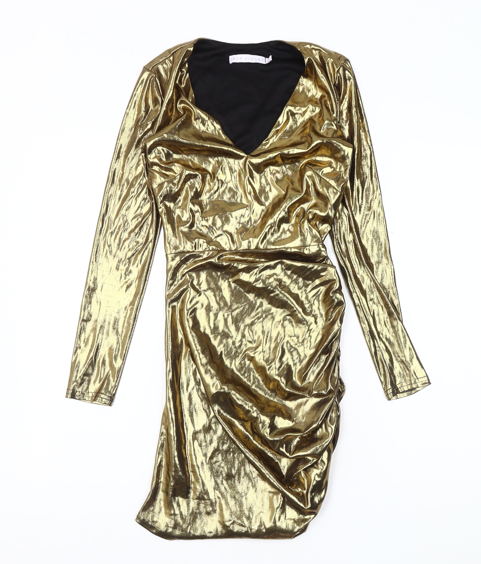 Turn heads at your next event with the elegant True Violet Women's Bodycon Dress. Radiating class and sophistication, this stunning knee-length dress in a striking gold hue is ideal for autumn and winter occasions. With its bodycon style, it offers a flattering fit that accentuates your curves. The long sleeves enhance its refined appeal, making it perfect for party or cocktail gatherings. The V-neckline adds just the right amount of allure, while the ruched detailing provides texture and depth to the ensemble. Made from a comfortable blend of polyester and elastane, this dress ensures a snug fit with a slight stretch for added comfort. Despite the slight creasing visible, the dress remains in excellent condition. Its pullover closure makes dressing up quick and effortless, perfect for those last-minute event plans. Pair it with your favourite heels and accessories to complete the look, making sure you stand out wherever you go. This dress is designed to make you look and feel your best at any special occasion. Machine washable, it promises easy maintenance, allowing you to enjoy its timeless style over and over. An excellent addition to your wardrobe, this True Violet dress offers endless possibilities for style and elegance.