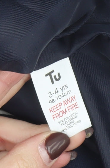Add a touch of smart style to your little one’s wardrobe with this charming navy blue blazer from Tu. Designed for girls aged 3–4 years, this well-tailored jacket combines comfort, practicality, and timeless character. Crafted from a high-quality blend of polyester and elastane, the outer fabric feels smooth and durable while offering a little stretch for ease of movement. Perfectly lined in polyester, it ensures a soft, comfortable fit that makes it ideal for all-day wear. The single-breasted front features a contrast button fastening, paired with white piping along the lapel and pockets for a classic, elegant touch. Two front pockets, adorned with matching white bow accents, complete the charming style, while its short, structured length adds a polished finish perfect for school events, parties, or smart-casual outings.With its blend of polyester and elastane, this blazer remains breathable yet durable, ideal for seasonal wear in spring or autumn. The fabric holds its shape beautifully while being easy to care for — simply machine wash and it’s ready for another day out. This versatile piece can be beautifully styled with dresses, skirts, or tailored trousers, making it a practical yet fashionable addition to any young girl’s closet.In excellent condition, this used Tu blazer shows minimal signs of wear and has been lovingly kept. There are no marks, stains, or defects visible, ensuring that it remains in wonderful shape for continued use. It’s an elegant, high-quality item that offers both style and comfort, ideal for school uniforms, family events, or more formal outings. A brilliant find for parents seeking stylish and wearable fashion for their little ones at a great value.