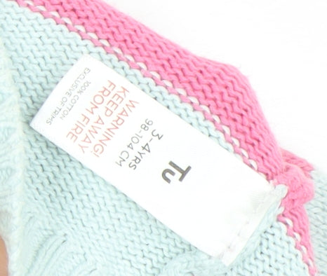 Brighten up your little one’s wardrobe with this delightful Tu girls’ multicoloured cardigan, perfect for layering through the seasons. Designed in cheerful pastel stripes of pink, mint green, lavender, white and red, this cardigan brings a playful touch to any outfit. The piece features charming embroidered details of strawberries and flowers near the hem, adding a whimsical and cheerful character that children will love. Made from 100% cotton soft knit fabric, it ensures a comfortable, breathable fit that feels gentle against the skin, ideal for all-day wear. This lightweight, machine washable cardigan features a classic crew neckline, a button front fastening for easy dressing, and ribbed cuffs and hem for a snug finish. The quality craftsmanship typical of Tu clothing guarantees durability, while its versatile style makes it a perfect choice for everyday casual wear, trips to the park, or layering over party dresses on cooler days. With its combination of practicality and adorable design, it’s ideal for spring, autumn, and mild winter days.The cardigan is in excellent pre-loved condition with no visible defects, maintaining its original softness and colour vibrancy. Though the original tags are not included, the item shows minimal signs of wear, offering great value for money. Perfect for parents seeking a cute yet comfortable knitwear option for their 3–4-year-old, this Tu cardigan pairs beautifully with jeans, skirts, or leggings for effortlessly sweet outfits.Delightfully colourful, comfortable, and easy to care for, this Tu girls’ striped embroidered cardigan will be a go-to favourite for countless occasions. A charming balance of fun design and everyday practicality, it’s a brilliant addition to any young girl’s wardrobe.