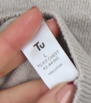 Elevate your casual and smart-casual wardrobe with this Tu Men Beige Cotton Crew Neck Jumper in size L. Crafted from 100% pure cotton, this lightweight pullover jumper offers a soft, breathable and comfortable feel—perfect for layering throughout the seasons. The tight-knit structure provides a refined finish, while the ribbed cuffs, neckline and hem ensure a neat shape retention for lasting wear. Designed in a versatile beige tone, this jumper easily complements a variety of outfits, from jeans and trainers for a relaxed weekend look to chinos and loafers for a more polished appearance. The breathable cotton fabric keeps you comfortable whether worn under a blazer in cooler months or on its own in spring. With a classic crew neckline, regular fit and subtle design, this jumper is an essential wardrobe staple that offers timeless style and effortless sophistication. Perfect for casual days at the office or relaxed evenings out, this Tu pure cotton jumper combines comfort, durability and understated elegance. Machine washable for easy care and long-lasting wear, it is both practical and stylish, making it a smart choice for any modern man. With light previous use but no visible damage, this piece remains in excellent condition and ready to wear. A great value addition to your knitwear collection, offering high quality and everyday versatility without compromising style.