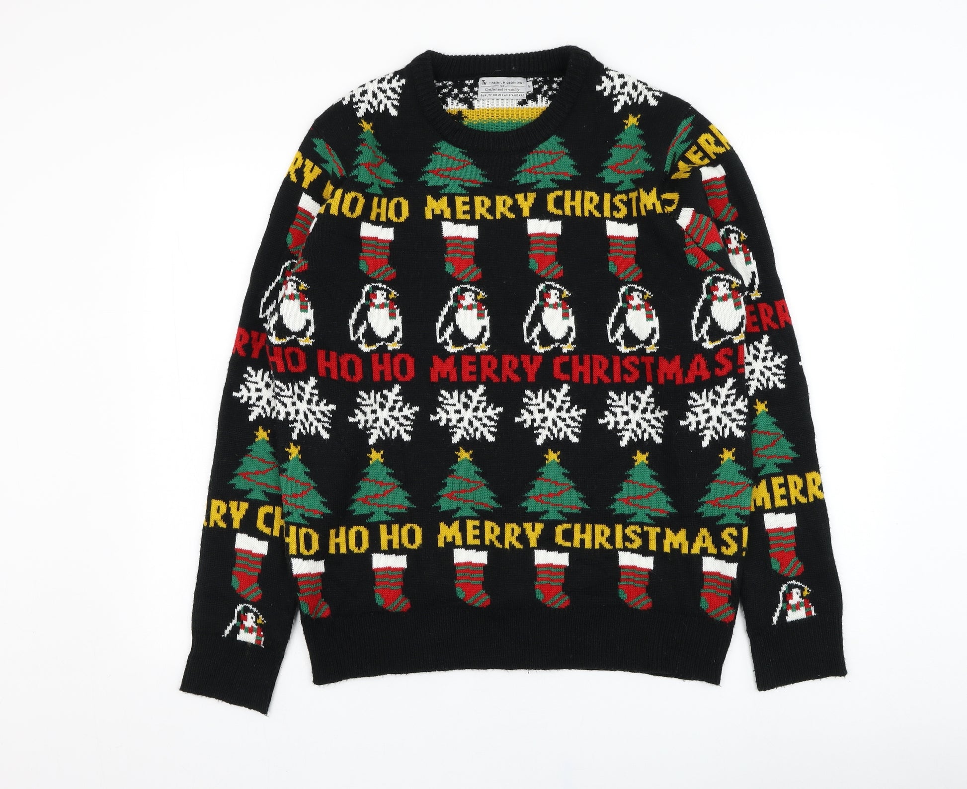 Mens Black Round Neck Acrylic Pullover Jumper Size M - Christmas