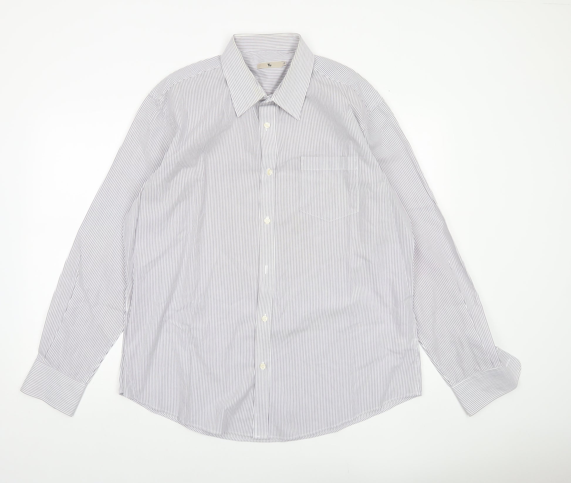 This Tu men's formal dress shirt is a must-have addition to your wardrobe, perfect for professional and special occasions alike. Designed in a crisp white with subtle vertical stripes, it strikes the right balance between timeless style and modern sophistication. With a point collar and long sleeves finishing in barrel cuffs, this shirt delivers a tailored appearance that suits business meetings, weddings, and formal events while remaining comfortable enough for daily office wear. Crafted from a quality blend of 55% cotton and 45% polyester, the shirt is both breathable and durable. The cotton provides softness for all-day comfort, while the polyester ensures that the fabric keeps its shape and resists creasing, making it easy to maintain and care for. Machine washable, this shirt is designed with convenience in mind for the modern man who values both practicality and style. The shirt comes in a size 17 (43 cm neck) with a 55 cm chest and a length of 80 cm, offering a classic regular fit that flatters a wide range of builds without being restrictive. The button-up closure and single chest pocket add traditional finishing touches, while the woven striped fabric elevates its polished look. Ideal for pairing with tailored trousers or a smart suit, this shirt transitions seamlessly from the office to evening functions. Whether you're dressing for a wedding, a formal dinner, or everyday business settings, this versatile piece covers every occasion with ease. Its understated stripes make it more visually engaging than a plain solid, offering a stylish touch without overwhelming the classic design. In very good condition, this shirt shows minimal signs of previous wear and remains in excellent wearable shape. Light creasing is present, but no stains, tears, or visible damage affect the piece. With a focus on comfort, style, and durability, this Tu shirt is a reliable choice for men seeking a balance between affordable quality and sophisticated design.