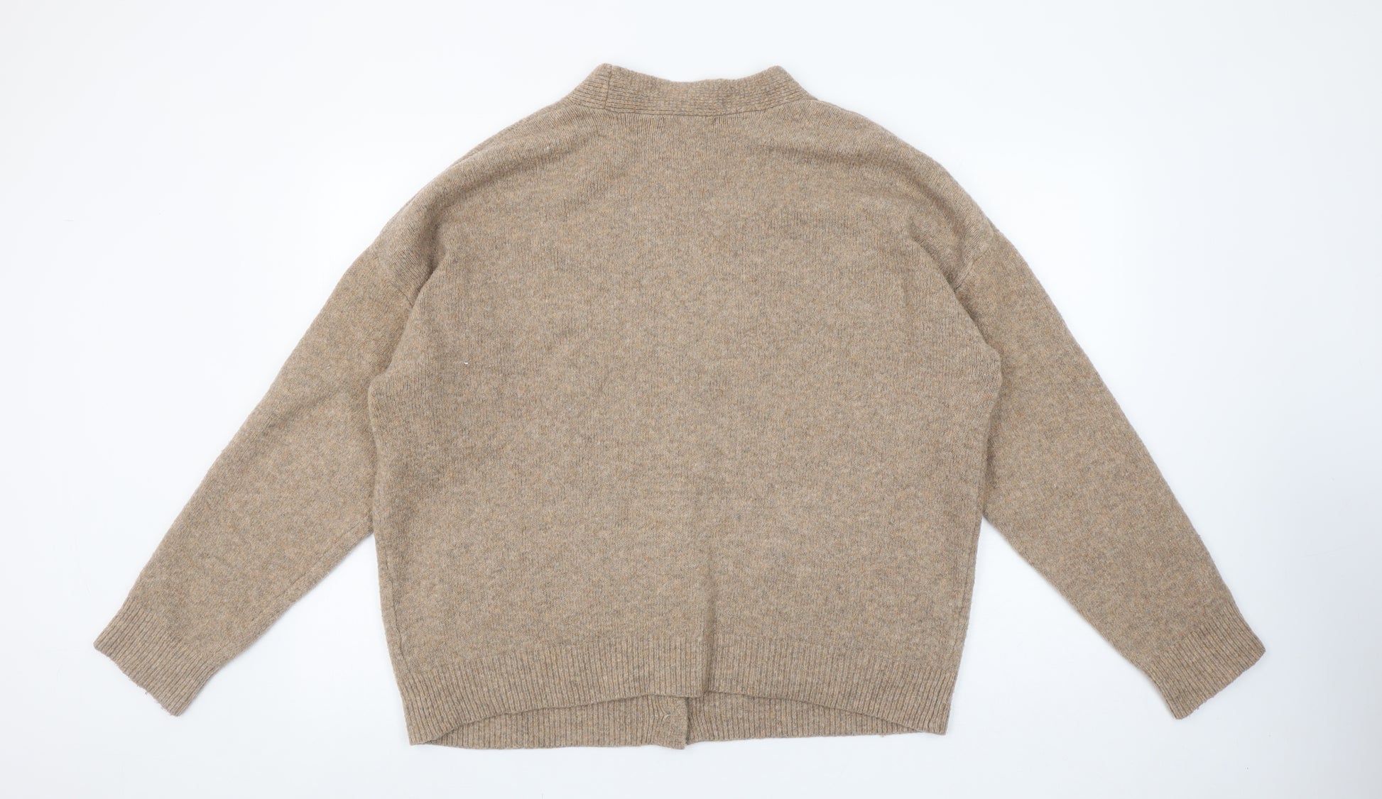 Step into timeless comfort with this Tu Woman beige V-neck cardigan, perfect for layering throughout the cooler seasons. Crafted in a soft knit blend of acrylic, polyester, elastane and wool, it delivers both warmth and breathability without compromising on comfort. The cardigan’s relaxed fit makes it ideal for casual days, providing a cosy and flattering silhouette suited to all shapes. Designed with long sleeves and neatly ribbed cuffs and hem, this piece ensures a snug feel with flexibility in every wear.The cardigan features a button-down front closure with attractive textured buttons that add a subtle touch of uniqueness. Two front patch pockets bring practicality and style, offering a place to keep small essentials within easy reach. Its neutral beige hue gives it incredible versatility — pair it effortlessly with jeans for a laid-back weekend look or layer it over a dress for a polished, everyday outfit. With its soft knit construction and breathable fibres, this cardigan can easily transition across autumn and winter while still being light enough for cooler spring evenings.The combination of materials — acrylic for durability and shape retention, polyester for resilience, elastane for stretch, and a touch of wool for warmth — ensures a quality finish that maintains its look and feel. Tu’s focus on easy-care fashion makes this cardigan machine washable, making it as practical as it is stylish.Whether worn buttoned up over a blouse or open as an easy outer layer, this flattering cardigan offers a timeless wardrobe essential. The result is a chic, comfortable knit piece that blends versatility and ease, perfect for anyone seeking cosy sophistication in their everyday style.