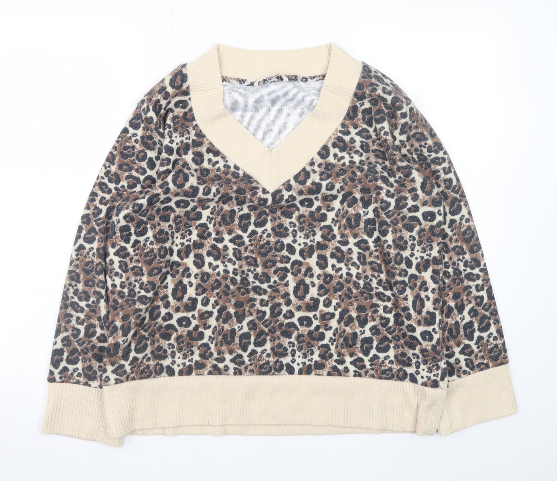 Tu Women Beige Leopard Print V-Neck Pullover Jumper Size M