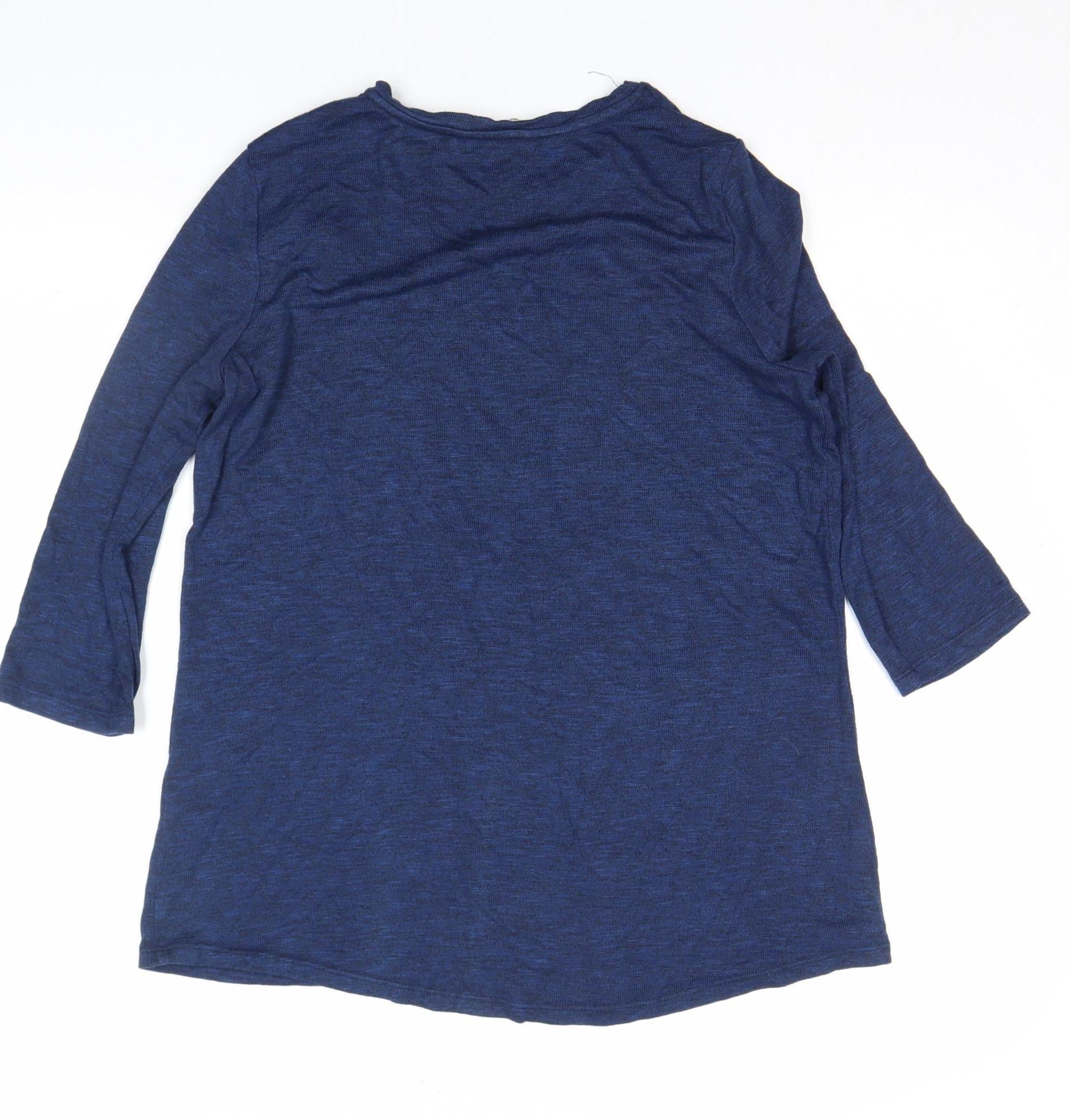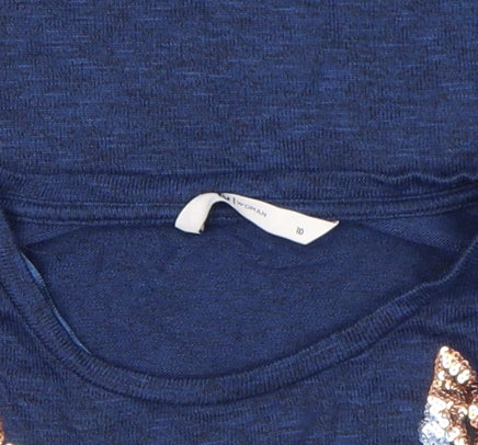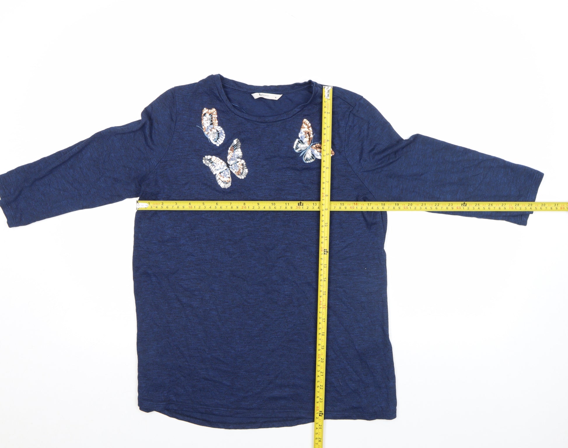 Add a touch of sparkle to your casual wardrobe with this lovely women’s blue top from Tu. Designed in a flattering regular fit, this soft jersey top combines comfort and style with delightful sequin butterfly embellishments that catch the light and bring a playful, feminine charm. Made from a smooth blend of viscose, polyester, and elastane, the fabric offers a breathable and lightweight feel with a gentle stretch for easy movement. The 3/4 length fitted sleeves and classic crew neckline make it versatile enough for layering or wearing on its own during warmer months. The deep blue hue pairs effortlessly with jeans, skirts, or casual trousers, making it perfect for everyday wear or relaxed weekend outings. Its pullover design allows for quick and easy dressing while maintaining a polished appearance. The soft texture and subtle shimmer make it a wardrobe favourite for any season, ideal for spring, summer, and autumn when you want comfort without compromising on style. Whether dressing for a casual lunch, a walk in the park or a relaxed evening at home, this top’s simple design enhanced by charming sequin detailing adds that special something to your everyday looks. Machine washable for convenience, it’s a low-maintenance yet attractive piece. In excellent pre-owned condition, showing only minimal signs of gentle use and no major flaws, it’s a beautiful addition to any collection of laid-back and feminine styles. A go-to choice for those who appreciate understated sparkle and comfortable everyday fashion.