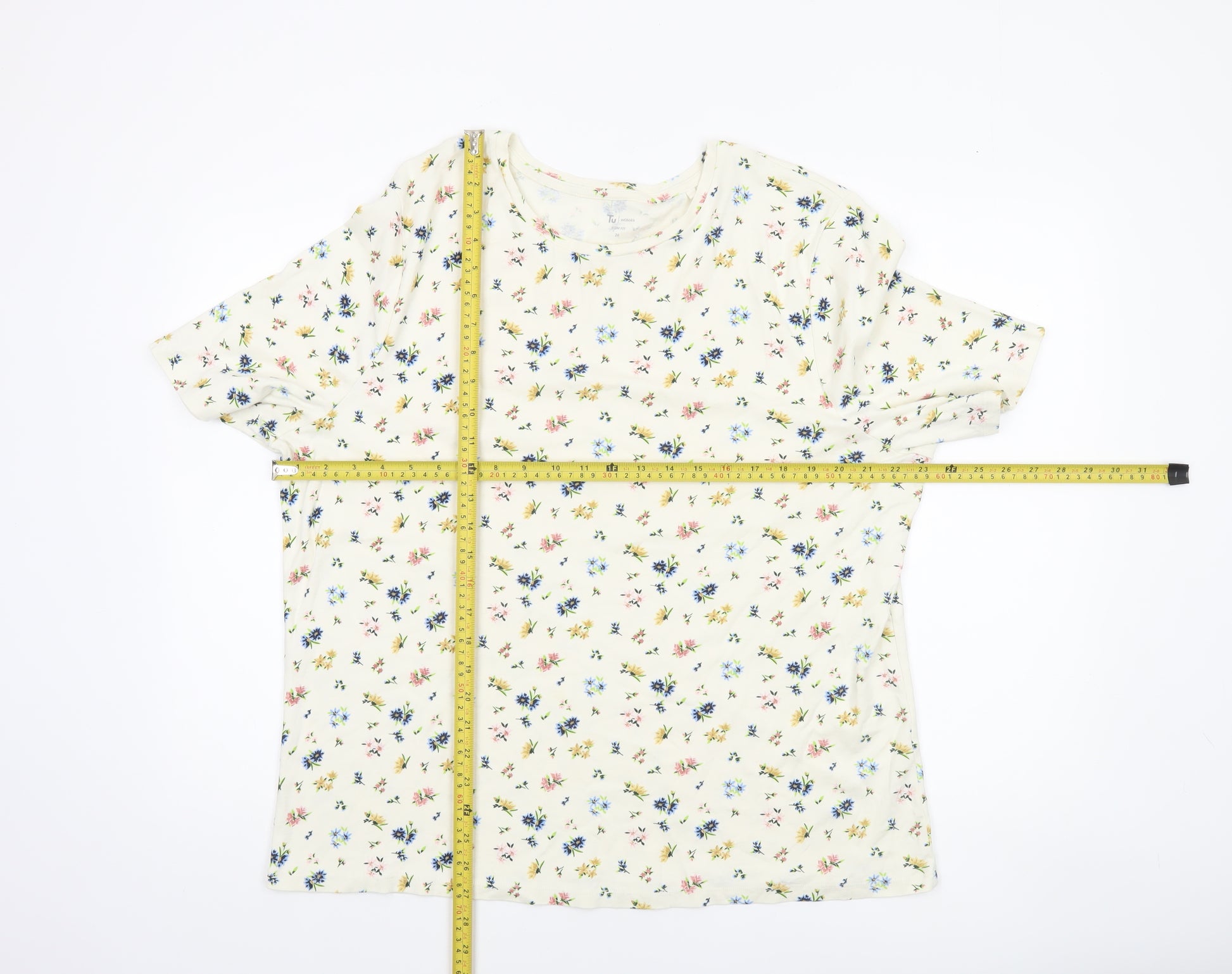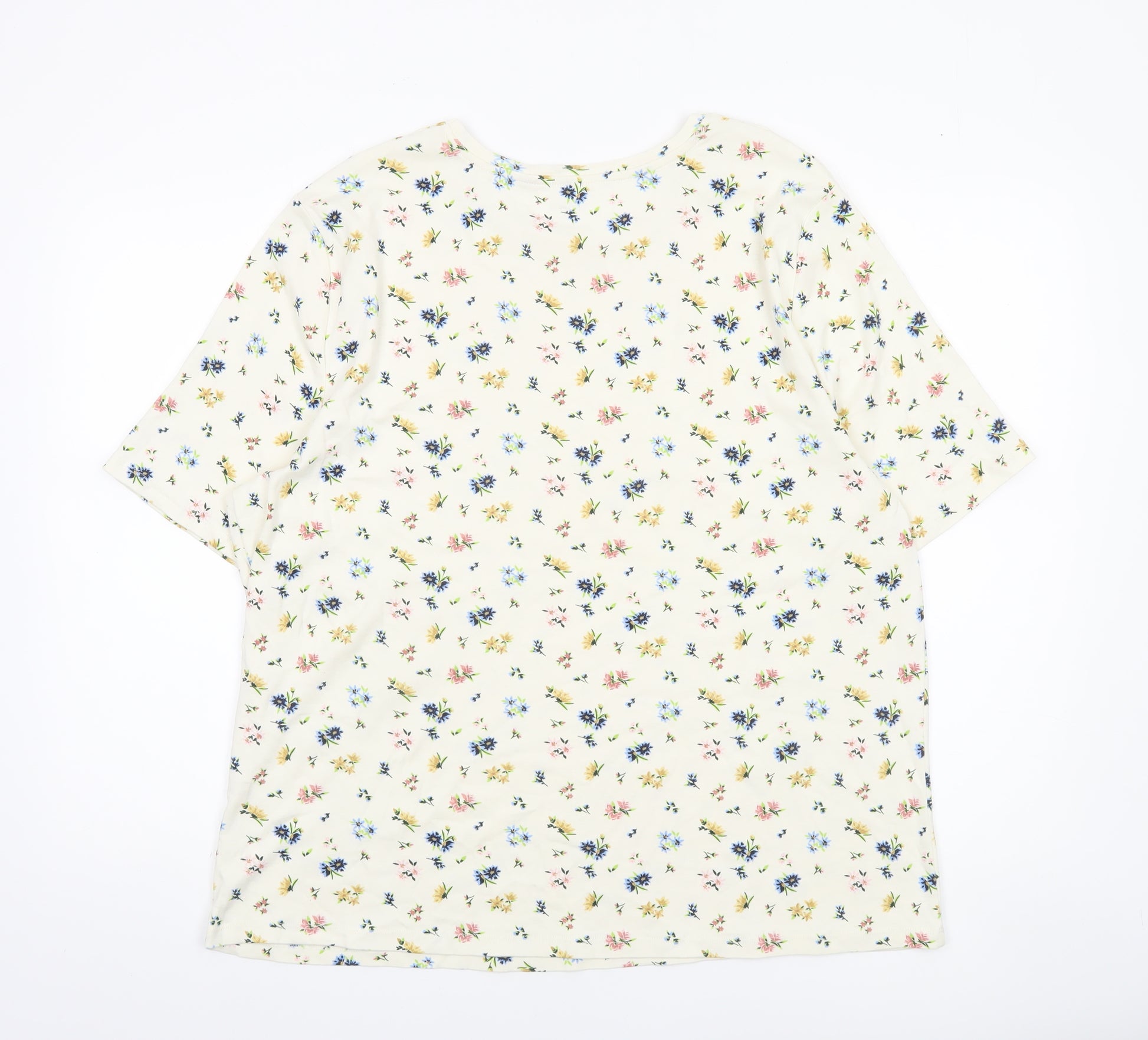 This lovely women’s T-shirt by Tu offers a fresh and feminine touch to your everyday wardrobe. Crafted from 100% cotton, the soft jersey fabric is breathable and lightweight, perfect for warmer months or easy layering. The ivory base is sprinkled with a delicate floral print featuring shades of blue, pink, and yellow, giving the top a charming and summery appeal. Designed with a classic crew neckline and short sleeves, it delivers effortless comfort and versatility for casual wear. The regular fit ensures a flattering shape that drapes naturally while remaining easy to move in throughout the day. Ideal for pairing with jeans, leggings, or shorts, this floral tee adds brightness and style to your outfit without compromising on comfort. The pure cotton material ensures comfort for all-day wear and is machine washable for easy care. Suitable for casual outings, garden gatherings, or relaxed weekends at home, this floral T-shirt balances timeless simplicity with subtle charm. Despite light previous wear, it remains in excellent condition with no visible flaws, maintaining its softness and colour. This versatile essential brings the ease and casual chic that every wardrobe needs, adding a gentle touch of floral elegance to your day-to-day look. Perfect for spring and summer styling, it’s an affordable addition that combines reliability, comfort, and sweet seasonal design. Refresh your collection with this Tu floral cotton short sleeve T-shirt, a beautiful staple to rely on all season long.
