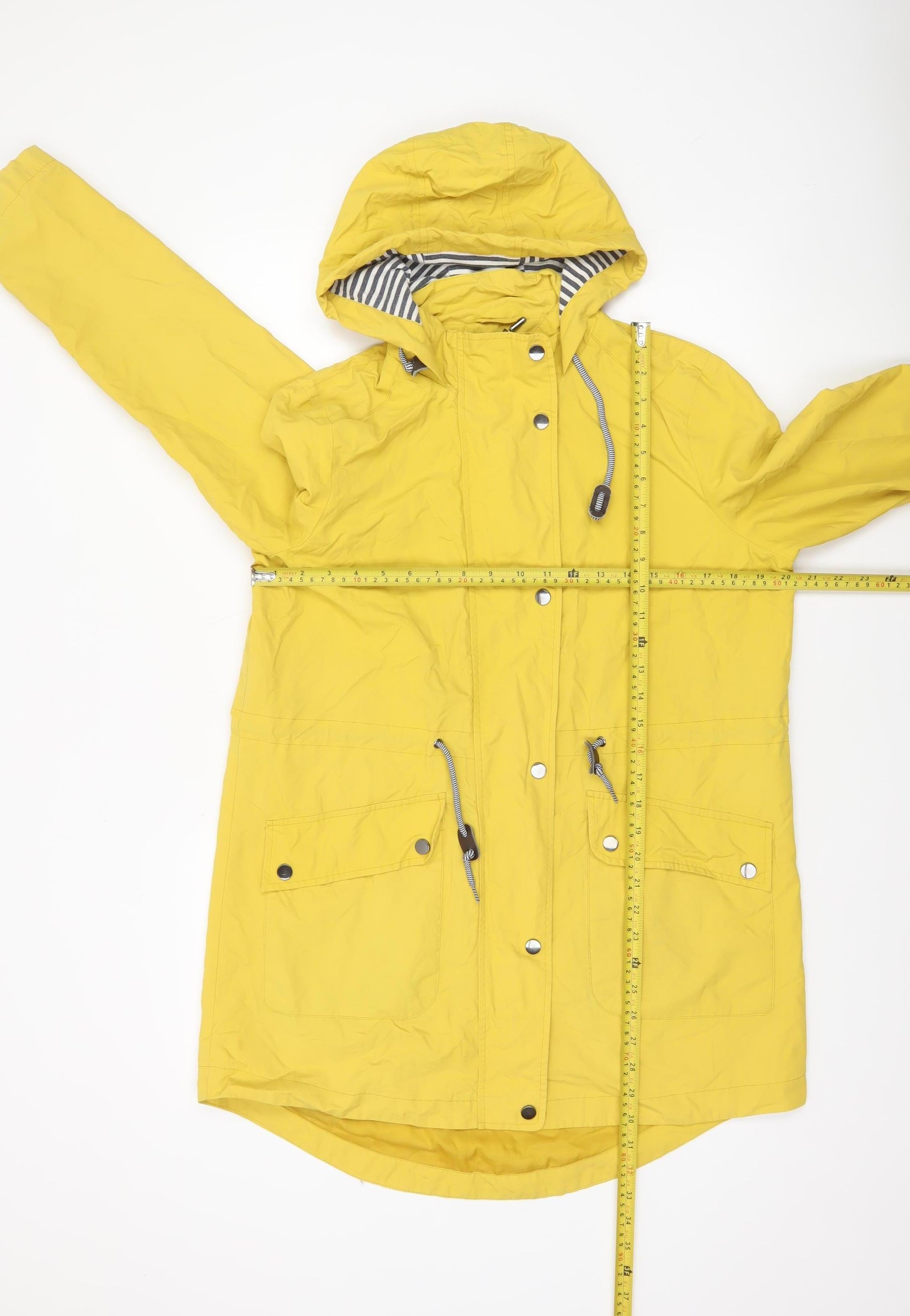 Brighten up cloudy days with this cheerful yellow women’s rain coat from Tu. Designed in a vibrant tone that’s sure to lift your spirits, this practical mid-length jacket blends a flattering shape with everyday comfort and weather protection. Crafted from durable 100% polyamide, it’s naturally water resistant to help keep you dry while out and about. The fully lined interior, made from a mix of polyester and cotton, offers a soft finish against the skin and adds a touch of warmth for transitional seasons like spring and autumn. This modern rain jacket features both zip and button closures, providing double protection against the elements. The drawstring adjusters at the hood and waist ensure a versatile fit that complements your figure, while the roomy front pockets add practicality for daily wear. Perfect for weekend getaways, countryside walks, or simply running errands in unpredictable weather, its clean lines and classic styling ensure it stays fashionable season after season. With a comfortable regular fit and long sleeves, this Tu coat balances functional design with everyday style. Whether paired with jeans and wellies for a relaxed look or layered over workwear on your commute, it’s ideal for those in search of an easy-care, machine washable outer layer. The simple, unpatterned design with contrast striped hood lining gives it an effortlessly stylish finish. In very good pre-owned condition, showing only light creasing from storage, this jacket has been gently worn and well cared for. Combining reliable quality, bright modern style, and sensible practicality at a reasonable price, this Tu hooded rain coat makes a fantastic choice for any wardrobe looking to stay chic and comfortable come rain or shine.