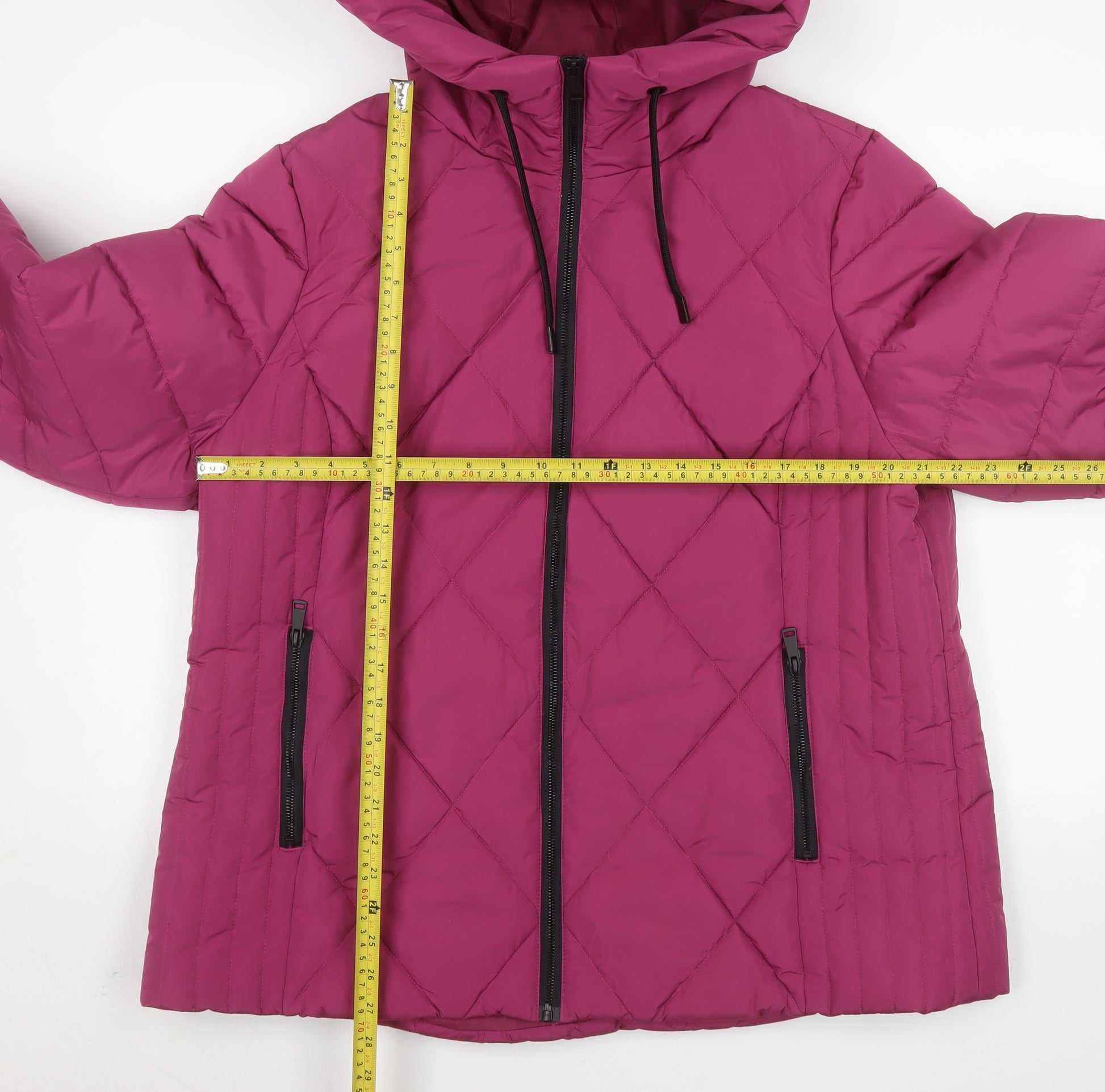 Stay effortlessly stylish and warm with this Tu Women's Quilted Hooded Puffer Jacket in a vibrant pink hue. Designed for comfort and practicality, this mid-length jacket features a durable 100% recycled polyester outer shell with a soft 100% recycled polyester lining and recycled polyester wadding for sustainable insulation. The diamond-quilted stitching adds structure while maintaining a modern and flattering silhouette. Ideal for chilly autumn and winter days, this jacket offers a blend of functionality and fashionable design. The full front zip closure, along with convenient zipped side pockets, adds both security and ease for everyday wear. The attached hood provides additional coverage against the elements, making it a versatile piece for travel, casual outings, or daily commutes. The sleek black zip accents contrast beautifully with the rich pink tone, giving it a subtly sporty yet feminine edge. Its mid-length cut delivers excellent coverage without restricting movement, making it ideal for layering over jumpers and tops during the colder months. Thoughtfully constructed using recycled materials, it aligns with eco-conscious fashion choices without compromising on quality. Perfect for women seeking warmth, comfort, and sustainability in one essential outerwear piece. Pair it with jeans and boots for a trendy winter look or wear it over casual trousers for smart-casual versatility. This Tu quilted jacket is machine washable for easy care and is in excellent pre-loved condition, showing minimal signs of wear. A high-quality, practical jacket ready to provide years of cosy warmth and effortless everyday style.