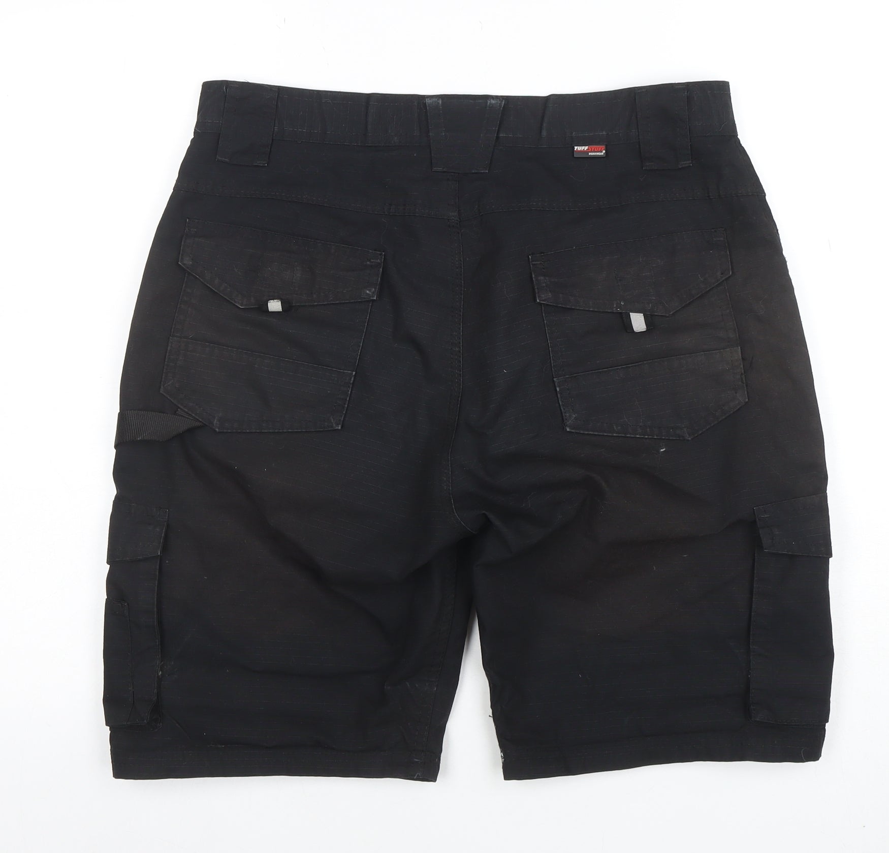 Stay comfortable and practical on the job with these Tuff Stuff men's black cargo work shorts, built to handle tough tasks in style. Crafted from a durable poly-cotton blend of 65% polyester and 35% cotton, these shorts offer the perfect balance between strength and breathability. Their lightweight yet robust canvas-type fabric ensures reliability and comfort for long working hours or active outdoor days. Designed with multiple utility pockets, including deep cargo pockets and handy side storage, they provide excellent functionality and ease of movement. The shorts feature a secure button and zip fastening, ensuring a firm yet comfortable fit around the waist. With a 32-inch waist (81 cm), they deliver a regular fit ideal for professional and casual wear alike. The no-pattern black finish makes them versatile for different occasions, from workwear settings to relaxed off-duty moments. Built for performance, these shorts are machine washable for easy care, quick-drying, and practical for everyday use. Their flat-front design and mid-rise cut provide a clean, contemporary look suitable for tradesmen, DIY tasks, or outdoor enthusiasts. The reinforced stitching and hardwearing material make them a popular choice for those who need dependable gear that lasts through wear and tear. Although gently used, they remain in very good condition with only minor fading from previous use. Perfect for builders, gardeners, handymen, or anyone seeking comfort and utility in one reliable pair of work shorts, these Tuff Stuff cargo shorts deliver great value and long-lasting quality. Add these fully functional shorts to your wardrobe and experience durability and comfort combined in essential everyday workwear.