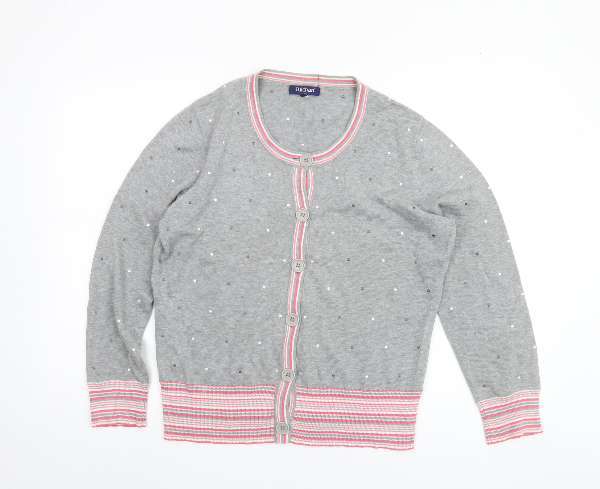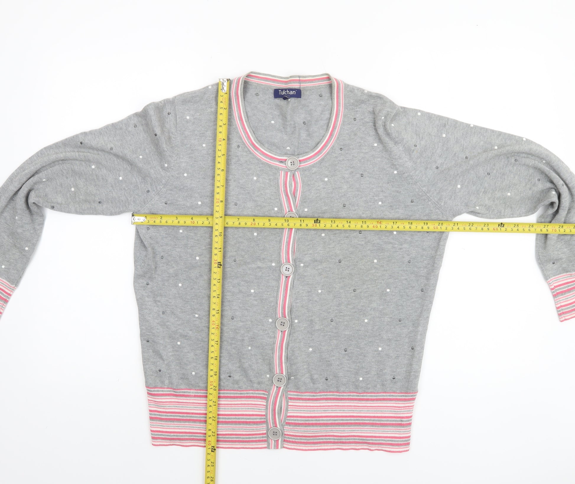 This charming women’s cardigan by Tulchan combines casual comfort with a touch of elegance, making it a versatile addition to your wardrobe. Fashioned in a soft grey knit adorned with subtle white and dark grey polka dots, this cardigan is crafted from 100% pure cotton, offering a gentle and breathable feel against the skin. The lightweight, tight-knit fabric makes it suitable for layering over tops or dresses in all seasons, while maintaining a refined, flattering silhouette. Designed for a relaxed and comfortable fit in a size Large, it features a classic crew neckline that complements its button-down front, with six tonal buttons adding a thoughtful finishing touch. Distinctive pink and grey striped trims along the cuffs, hem, and neckline introduce a playful contrast and elevate the overall style. The long sleeves provide warmth without bulk, ideal for layering during spring breezes or winter evenings. Highly wearable for everyday use, this piece pairs beautifully with jeans for a casual outing or with tailored trousers for a more polished look. Machine washable for easy care, this cardigan retains its shape and softness wash after wash. Due to the absence of original brand tags, the condition is listed as ‘Excellent’, showing minimal signs of previous wear and maintaining a clean, well-kept appearance. Perfect for those seeking comfort blended with timeless feminine design, the Tulchan Grey Cotton Polka Dot Cardigan is a chic yet practical choice that adds charm to any outfit, whether you’re heading out for a relaxed lunch, a light stroll, or spending a cosy evening at home. Its blend of classic patterning and soft cotton texture ensures it will be a much-loved staple season after season.