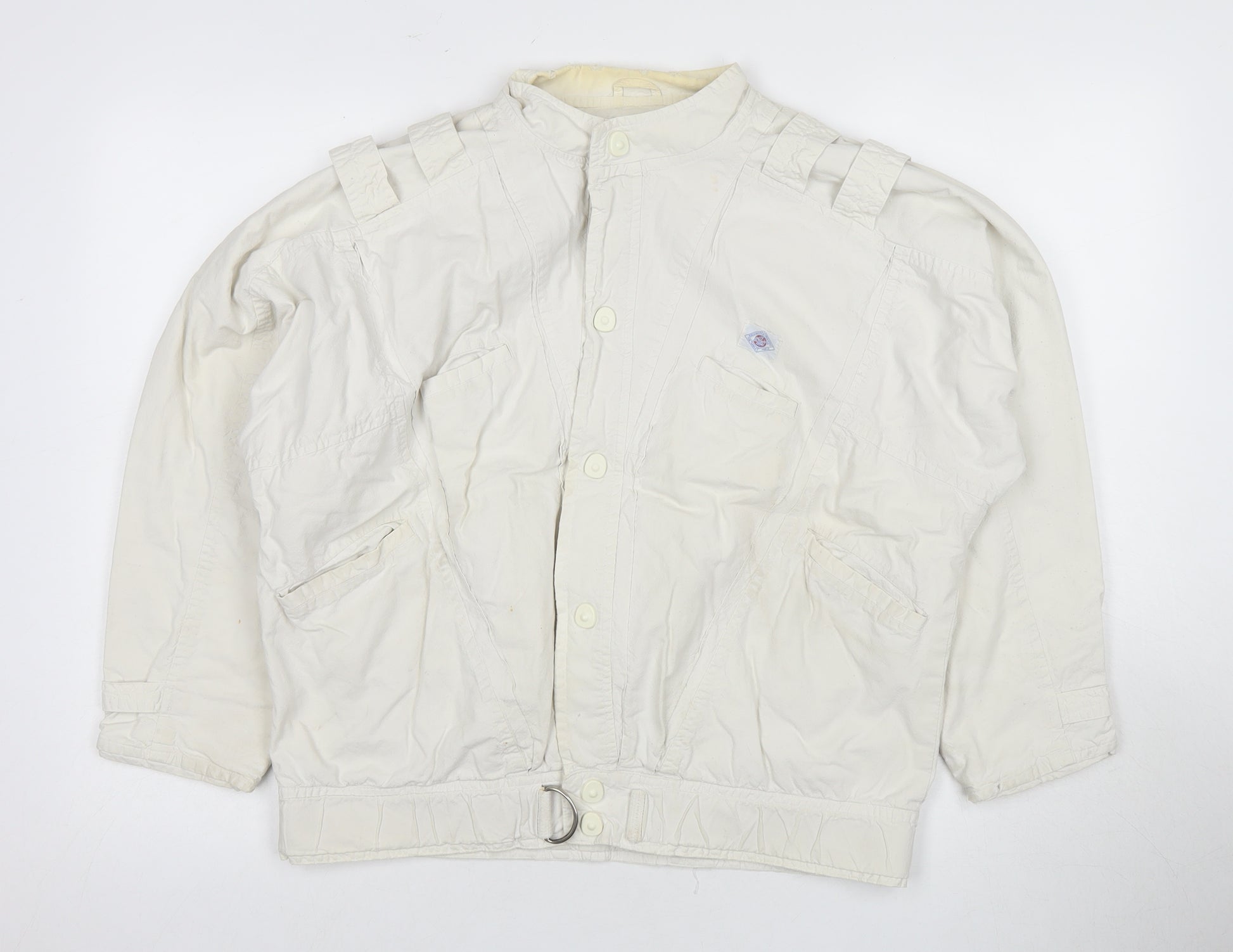 Step out in style with this vintage tus London women's jacket. Expertly crafted from 100% cotton, this mid-length jacket combines practicality with a touch of retro flair. Its classic white hue makes it a versatile piece, perfect for complementing a variety of outfits. The jacket features a collared design with button accents for a timeless silhouette. Designed for women, it fits comfortably under the regular size type, making it an ideal choice for everyday wear. The jacket is perfect for casual occasions, particularly in spring and autumn seasons, providing a breathable and lightweight feel suitable for transitional weather. Despite some slight fading and wear typical of vintage items, this jacket maintains its charm and is machine washable for easy care. Elevate your wardrobe with this versatile and stylish piece, a must-have for those who appreciate classic fashion with a modern twist.