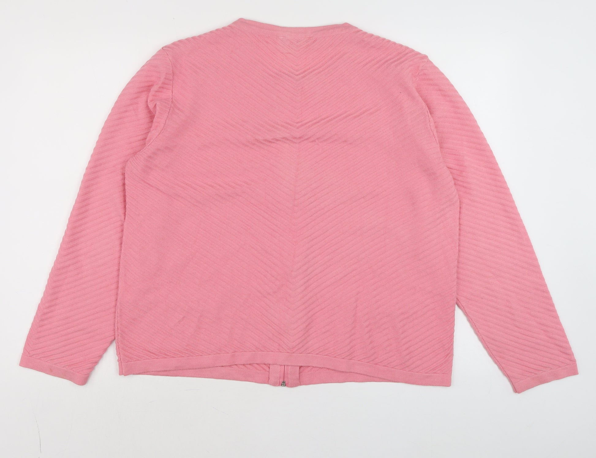 Elevate your everyday wardrobe with this charming pink full zip jumper by Twist. Designed specifically for women, this versatile piece effortlessly combines style and comfort, making it ideal for layering across multiple seasons. Made from a soft, breathable blend of 50% cotton and 50% acrylic, it ensures comfort and easy maintenance while maintaining a lightweight knitted texture that feels great against the skin. The jumper features a stylish round neckline and convenient full-length zip fastening that offers both ease of wear and the ability to adjust your style from casual open layering to a classic zipped look. The long sleeves provide extra warmth for cool spring or autumn days, while the simple, no-pattern design makes it a timeless addition to any wardrobe. Subtle vertical ribbed knit detailing adds understated texture and depth. Perfectly suited for casual occasions, this piece can be paired with jeans, skirts, or trousers for an effortlessly polished appearance. The relaxed fit provides both comfort and flexibility, and the craftsmanship ensures durability through regular wear. The colour pink gives it a graceful and feminine touch, suitable for refreshing any seasonal outfit. Easy to care for, it is fully machine washable, making it practical for everyday use. Conditioned as excellent with no visible flaws or damage, this knit jumper retains its shape and finish beautifully. A staple for any woman seeking a comfortable yet stylish layer that transitions easily from home comfort to casual social settings. Add this delightful Twist pink knit jumper to your collection for a relaxed yet refined touch to your everyday ensemble.