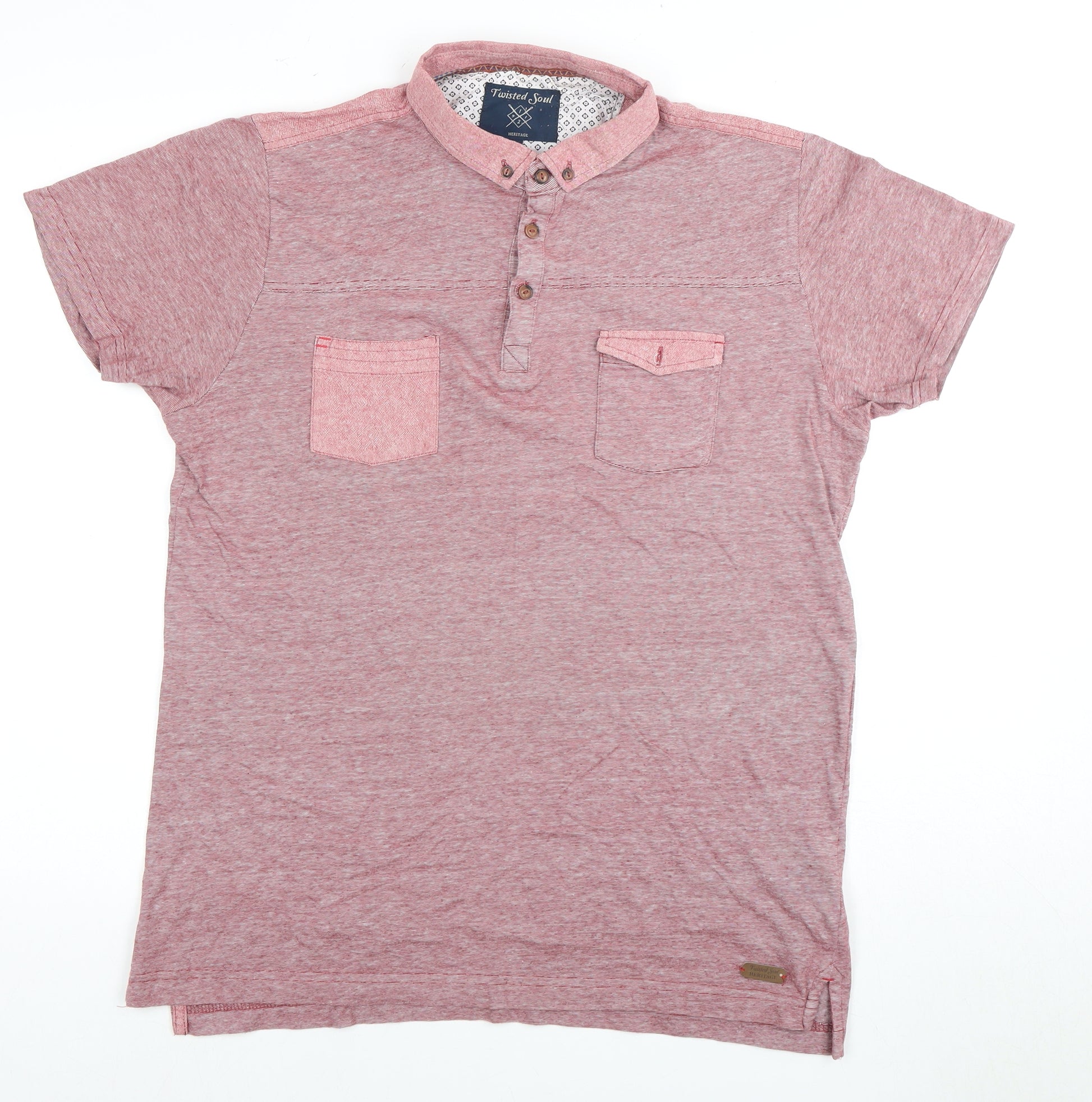 This Twisted Soul men's polo shirt in red is perfect for casual occasions, offering a classic look with modern appeal. Sized XL, it's ideal for a relaxed fit while maintaining a neat, tailored appearance. Constructed from 100% cotton, it promises comfort and breathability, making it a great choice for spring and summer seasons. The shirt features short sleeves and a stand-up collared neckline, enhancing the traditional polo style. A subtle logo accent adds a touch of brand distinction. The solid pattern and button closure give it a timeless look. Easy to care for, this polo is machine washable and durable. Minor wear is visible, indicating it has been gently used. This versatile piece can be effortlessly paired with a variety of casual trousers or shorts, making it a smart addition to any wardrobe. Invest in this classic polo shirt for an effortlessly stylish, yet laid-back look.