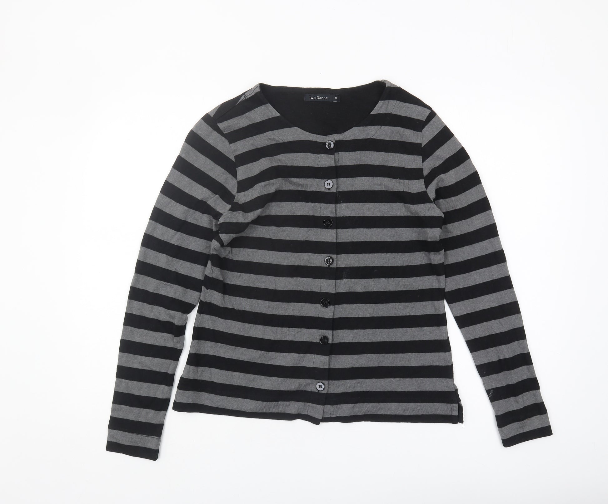 Elevate your wardrobe with this sleek Two Danes Women's Black Striped Cardigan. Crafted meticulously from a blend of 55% hemp and 45% cotton, this piece promises comfort and durability. The classic crew neck and button accents offer a timeless look, suitable for various occasions. Ideal for those who appreciate versatile and stylish essentials, this cardigan's design features a classic black and grey striped pattern that adds a sophisticated touch to any ensemble. Perfect for layering, its long sleeves provide warmth without compromising on style. Whether you're heading to a casual meeting or embarking on a weekend outing, this cardigan ensures you stay chic and comfortable. Add this essential piece to your collection and enjoy a blend of elegance and functionality.