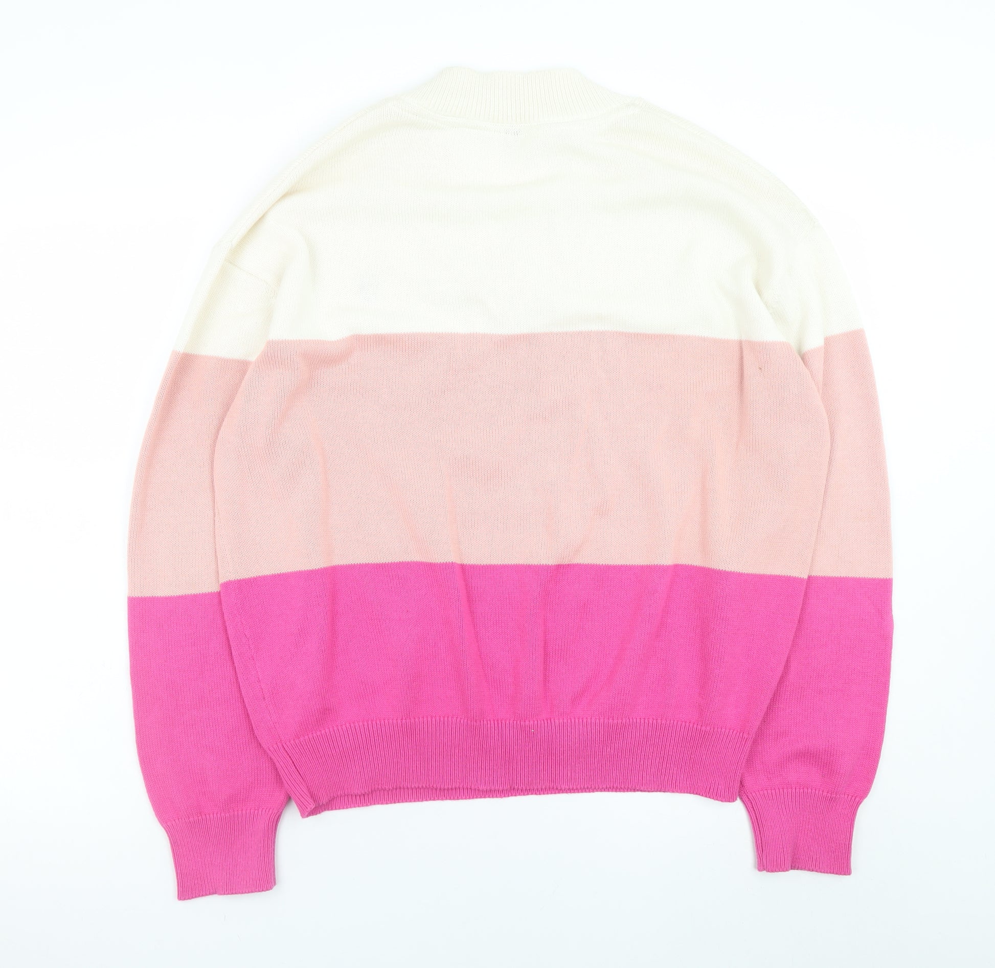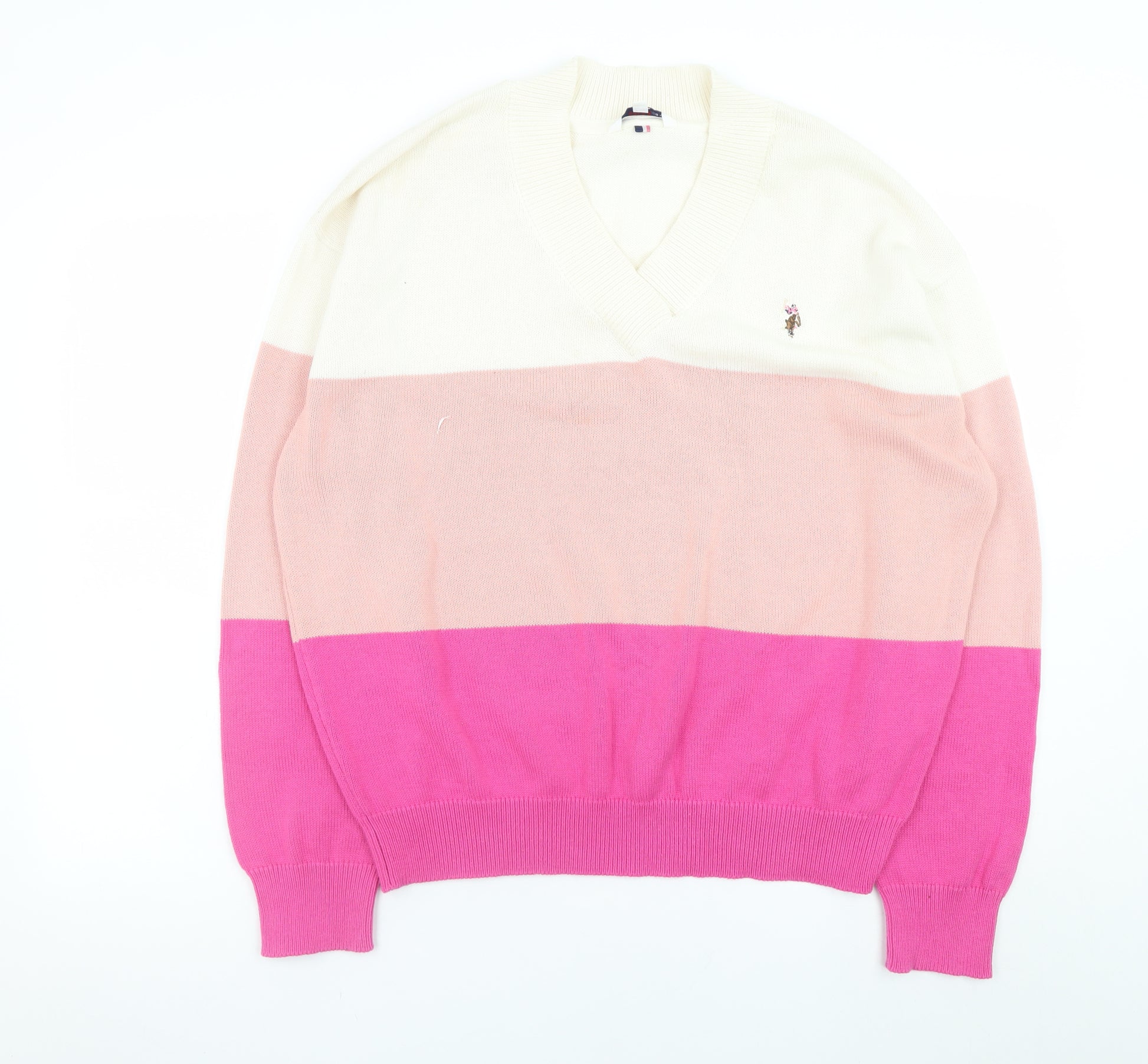 Add a refined touch to your casual wardrobe with this men’s U.S. Polo Assn. silver pink pullover jumper. Crafted from a soft and breathable cotton and polyester blend, this lightweight knit features horizontal stripes in cream, soft blush, and vibrant pink tones that provide a stylish contrast while remaining versatile enough for everyday wear. The classic V-neck design complements a regular fit silhouette, perfect for layering over a shirt or wearing on its own for a relaxed yet polished look.The front chest displays the signature embroidered U.S. Polo Assn. logo, showcasing the brand’s timeless heritage and quality craftsmanship. Designed with finely ribbed cuffs, hem, and neckline, this jumper ensures both a comfortable fit and shape retention throughout wear. Its all-season cotton-blend material delivers the ideal balance between softness, warmth, and breathability, making it suitable for autumn, spring, and winter.This men’s jumper is perfect for casual outings, weekends away, or smart-casual office attire. Pair it effortlessly with jeans, chinos, or tailored trousers to create a contemporary layered style. The lightweight construction makes it easy to transition between seasons while maintaining comfort and an effortlessly stylish appearance.In excellent pre-owned condition, this pullover shows minimal signs of wear and has been well cared for. It offers a modern approach to classic menswear, ideal for those who appreciate a combination of quality materials and iconic design. The versatile colour palette and premium cotton blend ensure a long-lasting addition to your wardrobe.Whether you’re meeting friends, travelling, or dressing down for a day out, this U.S. Polo Assn. jumper provides reliable comfort and timeless appeal — a key piece for any fashion-conscious man seeking a blend of sporty charm and heritage style.