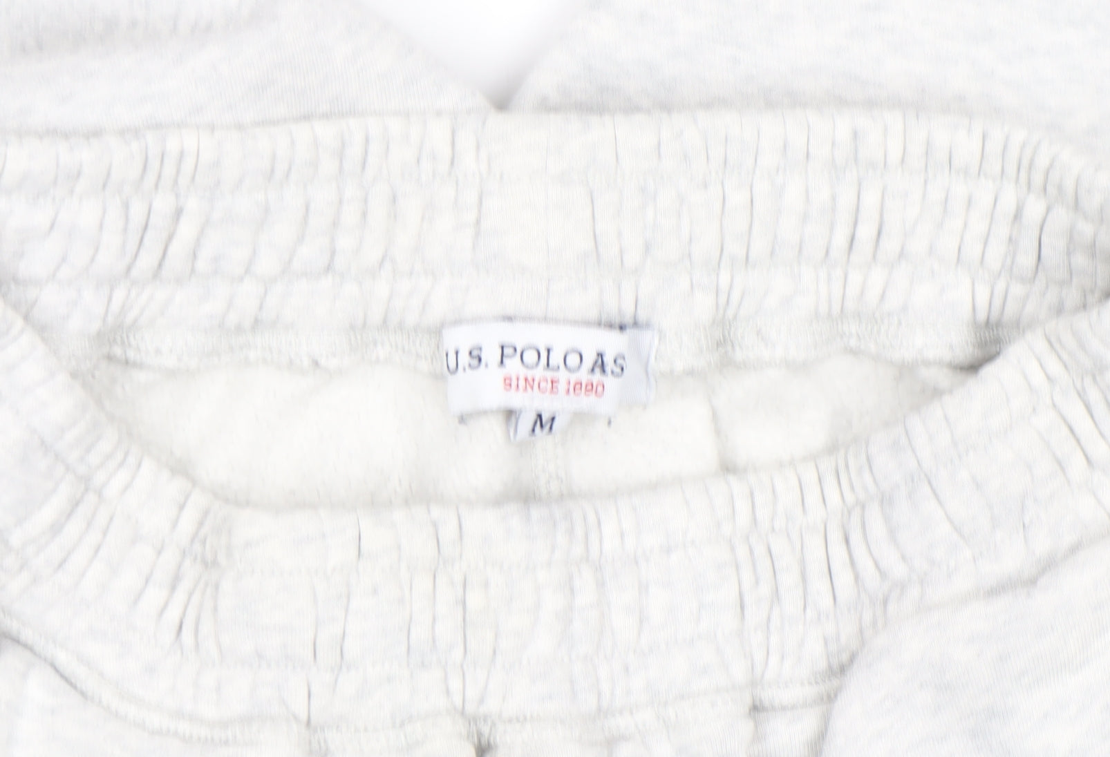 These U.S. Polo Assn men’s grey sweatpants are the perfect combination of comfort and casual athletic style. Crafted from a soft fleece blend of 80% cotton and 20% polyester, they provide a breathable and cosy fit ideal for workouts, lounging, or day-to-day wear. Designed with a drawstring elastic waistband for a secure yet flexible fit, these joggers offer excellent comfort and movement freedom. They feature a simple, sporty aesthetic with the brand’s signature red USPA logo and navy “3” detailing on the front, representing a clean, classic American sports look.The regular fit with a tapered leg silhouette and cuffed hems ensures a flattering shape while allowing easy mobility, making them a versatile option for gym sessions, running errands, or relaxed weekends. The side pockets add practicality for carrying small essentials, making these sweatpants both functional and stylish.Made for the active man, they are suitable for gym and training activities, jogging, or casual walking. Their fleece fabric helps retain warmth while staying breathable, ideal for cooler weather during autumn and winter, yet comfortably wearable through spring. The soft interior and durable exterior ensure longevity and long-lasting comfort wash after wash.These sweatpants are in very good used condition with minor faint stains on the leg, reflecting light pre-use but maintaining their overall quality and appearance. Perfect for men who appreciate a classic sportswear style with everyday comfort.Machine washable and easy to care for, these U.S. Polo Assn sweatpants are a wardrobe staple for any man seeking timeless, comfortable loungewear with a touch of American athletic flair. Pair them with trainers and a hoodie for a relaxed look or wear them with a polo shirt for a classic sports-inspired outfit.