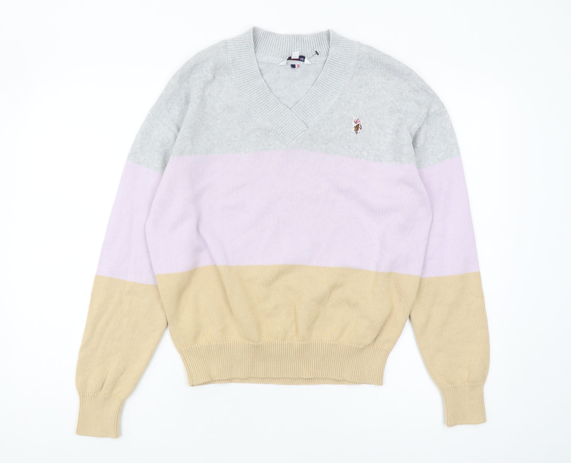 Add a touch of colour and style to your wardrobe with this U.S. Polo Assn. Women's Multicoloured V-Neck Jumper. Designed for comfort and elegance, this pullover sweater features a striking blend of grey, lavender, and beige stripes, perfect for making a statement during the cooler autumn and winter months. Crafted from a soft and breathable knit fabric composed of 60% cotton and 40% polyester, this jumper ensures comfort and durability. The V-neck design adds a feminine touch, while the long sleeves provide warmth on chilly days. Perfect for casual outings or cosy evenings indoors, this jumper offers versatility and style for any occasion. The iconic U.S. Polo Assn. logo on the chest adds a subtle but noticeable detail that speaks of quality and fashion. Pair it with your favourite jeans or a chic skirt to complete your look. Whether you're heading out for a casual day with friends or simply lounging at home, this jumper is a perfect fit. Machine washable for easy care, it combines practicality with style. Don't miss out on adding this essential piece to your collection.