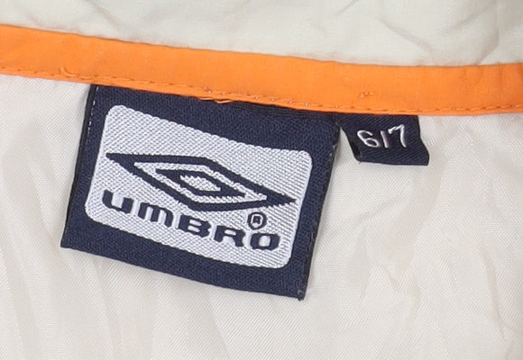 Explore unbeatable comfort and style with this Umbro boys pullover hoodie, perfect for active youngsters. Designed in a versatile beige hue, it's ideal for casual occasions throughout the autumn and spring seasons. Made from a durable blend of polyester and cotton, this hoodie ensures long-lasting wear while providing a cosy and breathable experience. The high neck design and lightweight fabric add functionality and style, while the practical zip closure and pockets are perfect for kids on the go. Featuring a trendy logo accent, this hoodie captures a sporty vibe that matches any casual outfit. Despite some creases and minor signs of wear, the hoodie remains in very good condition, promising a valuable addition to your child’s wardrobe. Whether for a family outing or school day, this Umbro hoodie offers both comfort and style for your young one. Don't miss out on this classic addition that every young boy would be proud to wear.