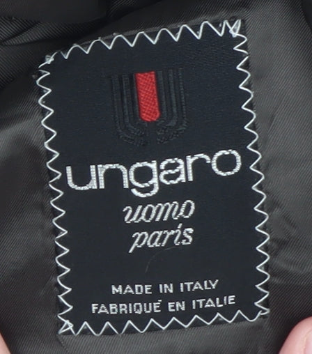 This elegant Ungaro Uomo Paris men's black blazer combines timeless Italian tailoring with high-quality materials for a sophisticated wardrobe essential. Expertly made in Italy, this jacket features a luxurious outer shell crafted from 65% virgin wool and 35% viscose, providing a rich, smooth texture while ensuring comfort and durability. Lined entirely with viscose for a refined finish, it offers both breathability and structural integrity. Designed in a mid-length, this classic fit blazer delivers a flattering silhouette with structured shoulders, double-breasted front closure, and notched lapels that enhance its formal aesthetic. The black tone ensures versatile pairing with a range of shirts and trousers, making it ideal for business, formal events, or elegant casual dressing. This Ungaro Uomo blazer captures the essence of understated Italian style, with fine attention to detail seen in the pocket flaps, carefully placed buttons, and smooth inner lining. Perfect for cooler autumn or winter months and transitional spring days, it provides a refined look suitable for smart office days or dressy occasions. In excellent pre-owned condition with only minor creasing from storage, it maintains a near-pristine appearance that reflects its premium craftsmanship. A true designer piece, this timeless black blazer offers exceptional quality at a fraction of the original high-end price. Add an air of sophistication and enduring style to your wardrobe with this Ungaro Uomo Paris men's blazer — a garment that effortlessly blends comfort, quality, and continental charm.