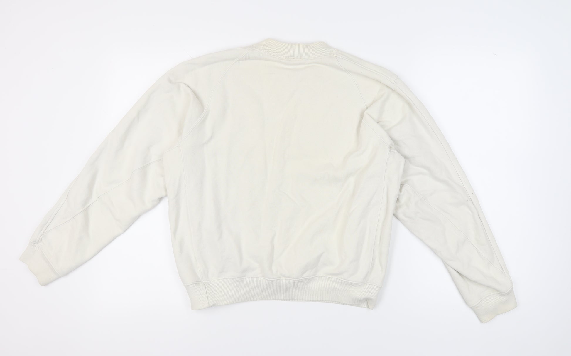This Uniqlo pullover sweatshirt in a classic ivory hue is a versatile addition to any casual wardrobe. Crafted from 100% cotton, it offers both comfort and breathability, making it perfect for all seasons. The jersey fabric type ensures a soft texture that feels gentle against the skin. Its crew neck design, combined with long raglan sleeves, provides a relaxed fit that is both stylish and functional. Ideal for unisex adults, this sweatshirt showcases a regular fit, allowing for easy layering over a variety of outfits. Whether you're lounging at home or stepping out for a casual day, this sweatshirt offers effortless style. Despite a slight stain on the front, it remains in good condition and is machine washable for easy care. Embrace a laid-back aesthetic with this wardrobe staple. Pair it with jeans or joggers for a timeless look.