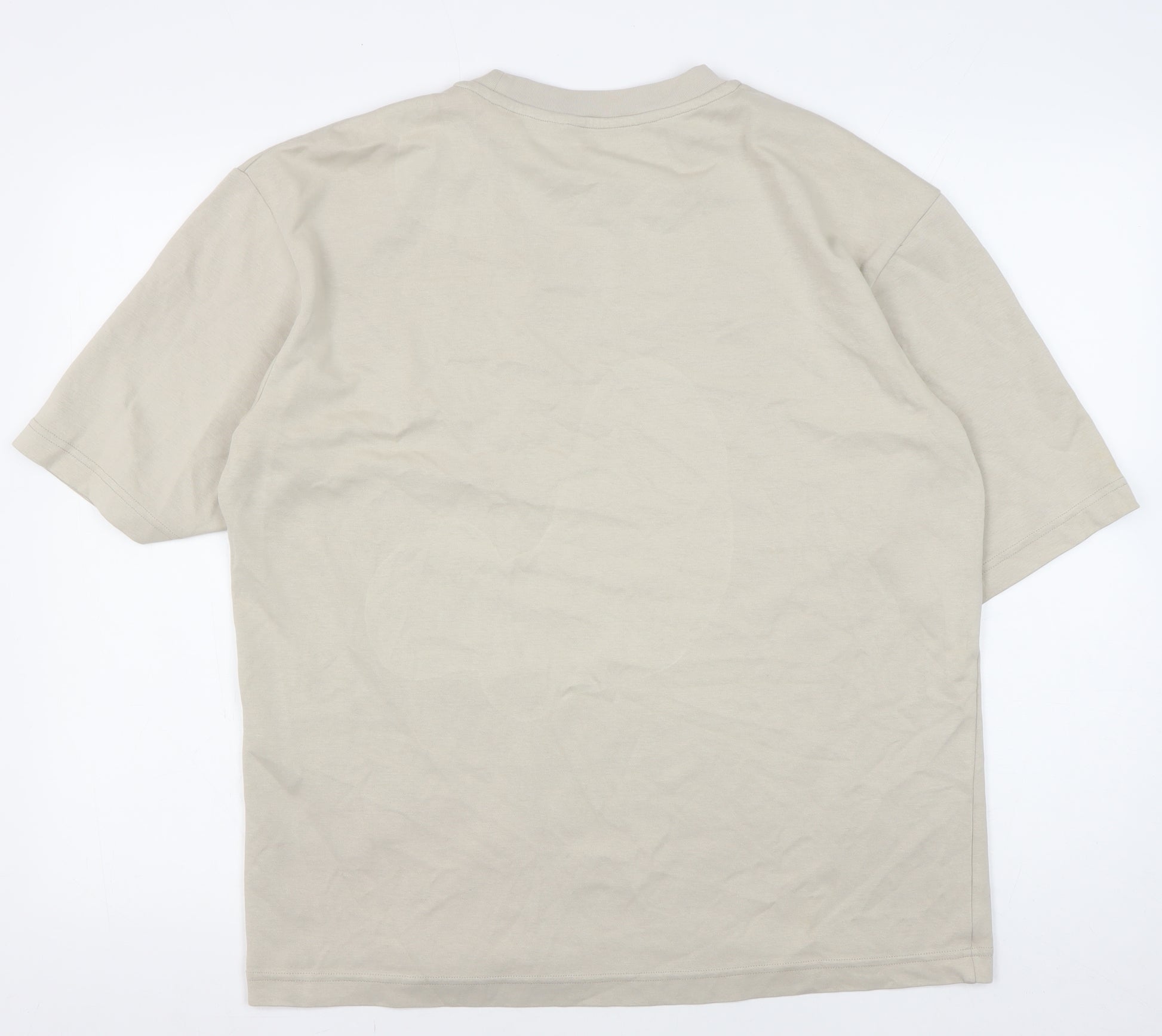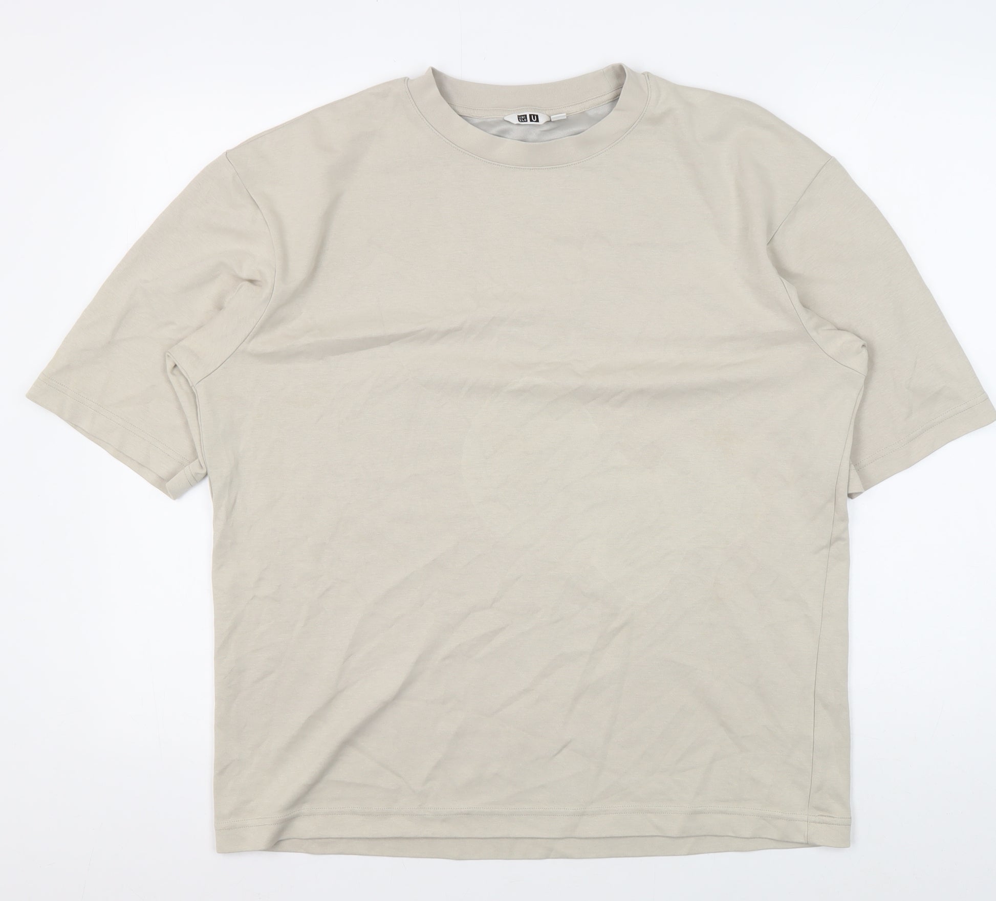 This Uniqlo men's T-shirt in stylish beige is a versatile addition to your wardrobe. Cut with a classic crew neck and short sleeves, it's comfortable for any occasion. Made in Vietnam, this all-season T-shirt is composed of a soft and breathable fabric blend: 53% cotton and 47% polyester, including recycled polyester. This ensures a comfy fit while being environmentally conscious. The solid pattern and simple design make it perfect for layering or wearing alone. While it doesn’t feature any additional accents, its straightforward design makes it a staple for casual outings, workout sessions, or lounging at home. The shirt is machine washable, enhancing its practicality for daily wear. Though previously owned, it's maintained in excellent condition with no notable defects, maintaining its look and feel without original sales tags. This piece from the modern 2020-2029 range offers comfort and a relaxed fit typical for Uniqlo apparel. Get this quality T-shirt today at a remarkably affordable price. Upgrade your casual wardrobe easily with this easy-care, classic piece.